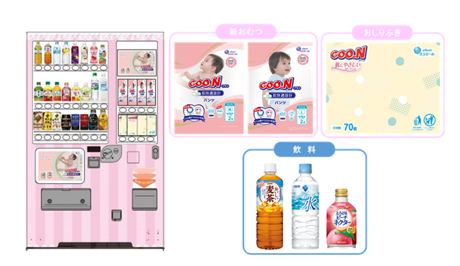 当社では、今後も自販機をご利用されるお客様に、本自販機を通して、子育て世代の方々が安心して外出しやすい環境づくりに向け、応援してまいります。