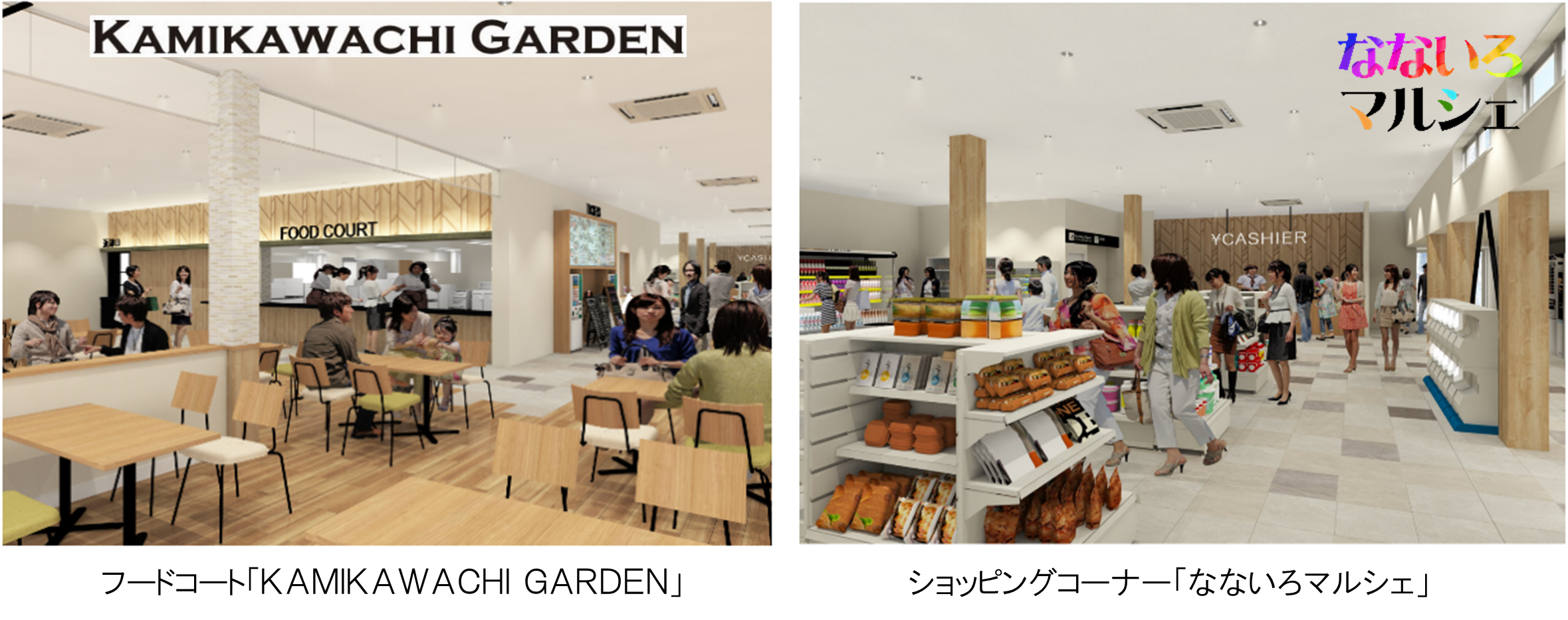 フードコート「KAMIKAWACHI GARDEN(かみかわちガーデン)」では、地元栃木県の食材を使用した料理をメインに、見た目にも美しいこだわりのメニューを提供します。ショッピングコーナー「なないろマルシェ」では、栃木県+東北6県=計7県(なないろ)の名産品を多数取り揃えます。