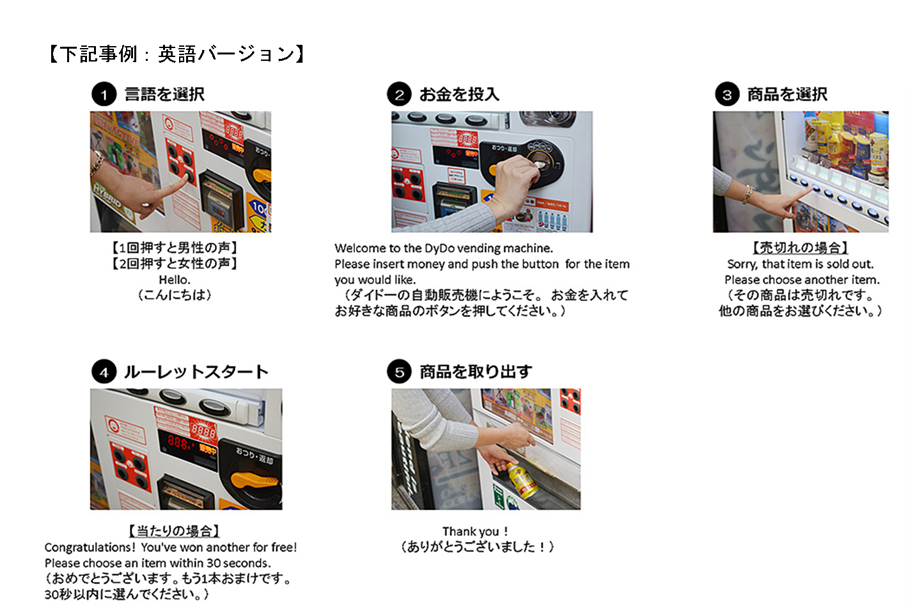 本自販機は、「大阪から元気を創りつづける」という同社の企業理念に基づき、「自動販売機を通じて、飲料を購入する以外の楽しみも提供できれば」と企画したもので、Osaka Metro御堂筋線を走行する車両をラッピングしております。また、多くの訪日外国人のお客様にも快適にご利用いただきたいと、英語や中国語など計4か国語で購⼊手順を説明するおしゃべり機能も備えており、ご利用される地域の皆さまや鉄道ファンをはじめ、多くの方々に楽しさと親しみを感じていただければと期待しております。