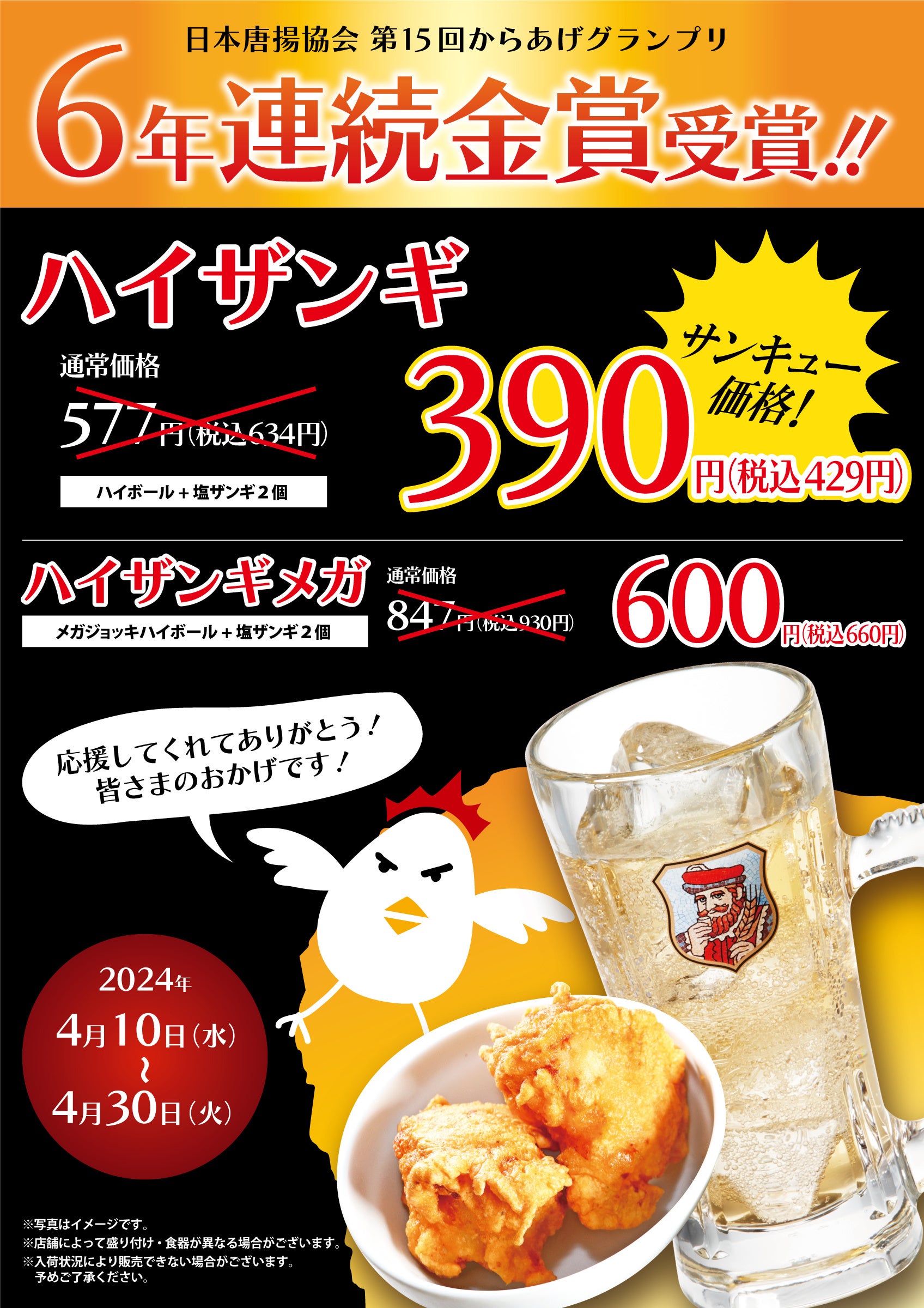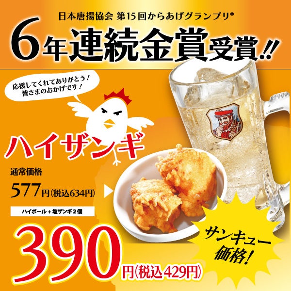 投票制でグランプリが決まるこの挑戦において、6年連続金賞を受賞できたのは応援してくださるお客様のおかげです。感謝の気持ちを込めて金賞受賞の「塩ザンギ」と「ハイボール」がセットになった「ハイザンギ」を特別価格で、期間限定販売いたします。