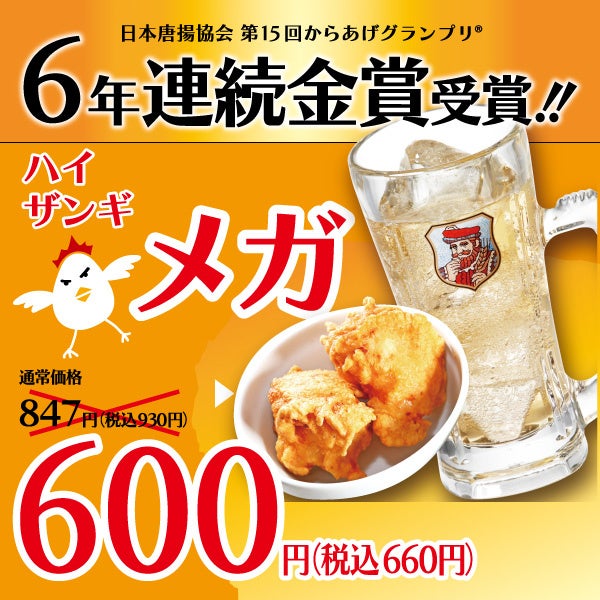 ■投票制のからあげグランプリ®にて6年連続で受賞したことを記念して、金賞受賞の「塩ザンギ」とハイボールをセットにした「ハイザンギ」を特別価格390円(税込429円)で、期間限定販売いたします。