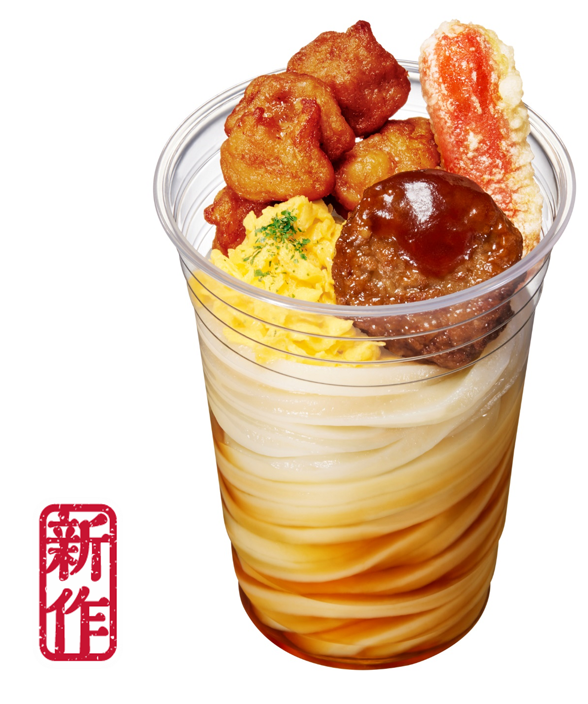 お子さまから大人まで大好きなハンバーグや、赤ウインナー天、鶏から、かきたまを豪快にのせたよくばりな一杯。