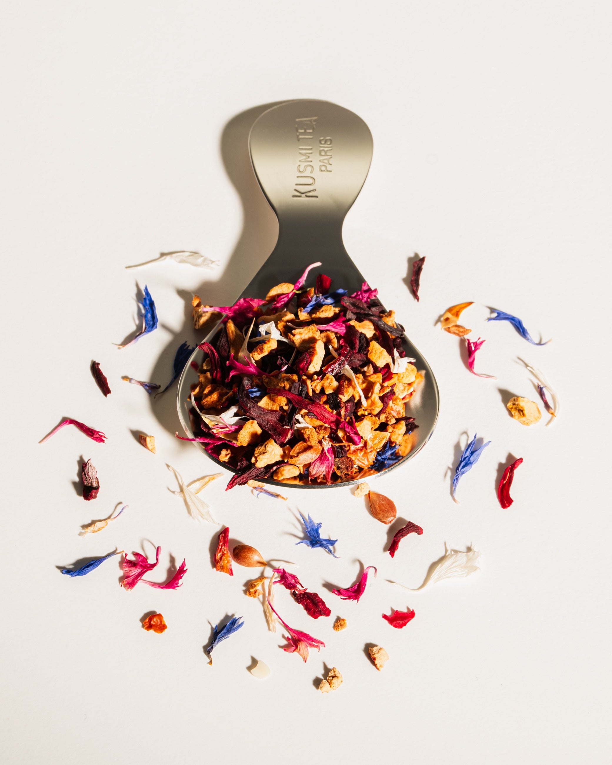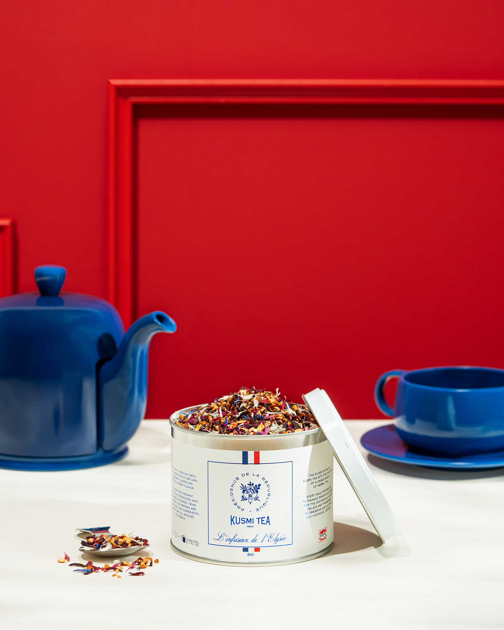 今回発売となる新作フレーバーは、ハイビスカス、矢車菊の花びら、林檎、そしてチェリーとブルーベリーをミックス。フランスの国旗を構成する青・白・赤の3色をそれぞれオーガニックの原料を使い表現した、カフェインフリーのハーブティーです。