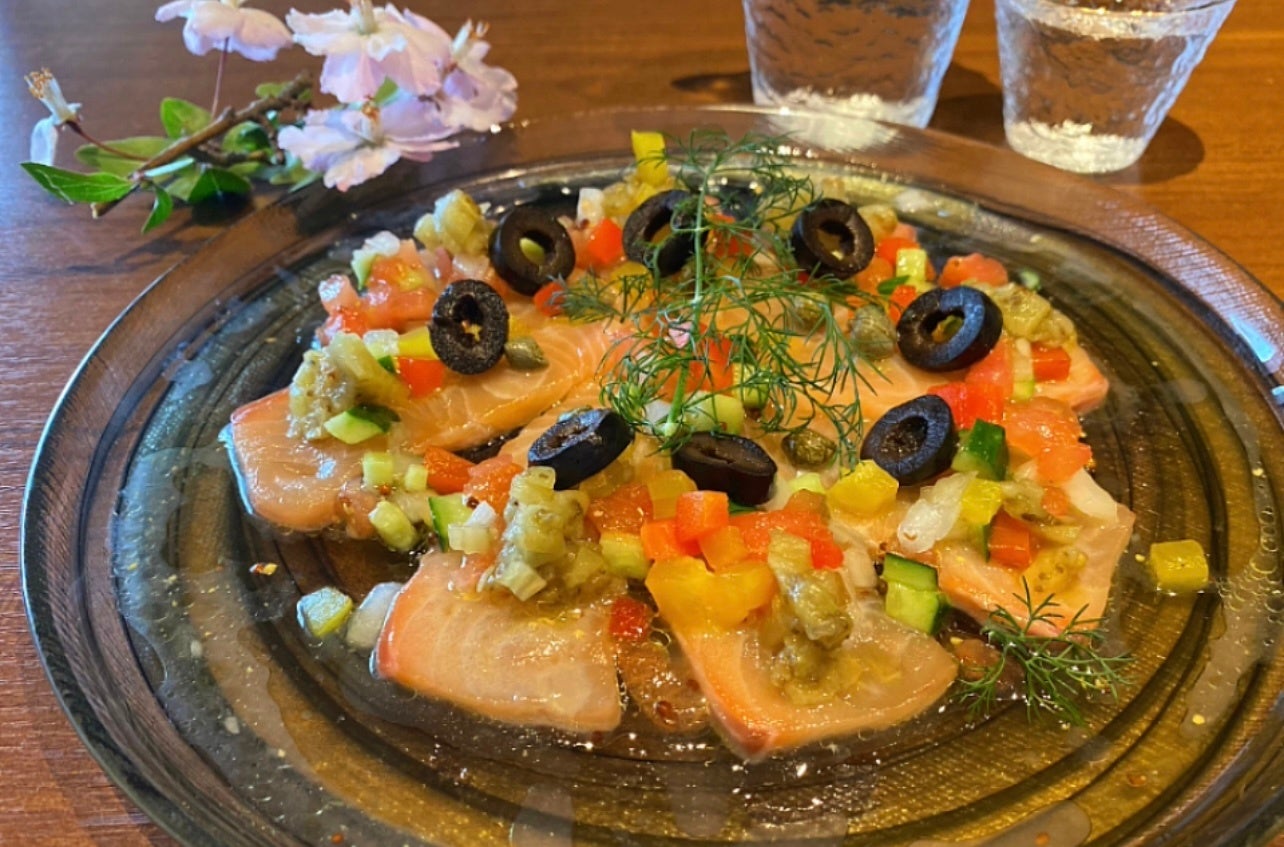 今回はそんなサクラマスを、ルイベやカルパッチョ、ムニエルでご用意しました。ルイベとは北海道に伝わる郷土料理で、魚を冷凍したまま薄く切って刺身として食べる料理です。口に入れた温度によって徐々にとろける食感を楽しめるので、脂ののったサクラマスの美味しさをより引き立ててくれます。ムニエルでは脂の旨みはもちろん、ふっくらとした身の柔らかさをご堪能いただけます。この春は旬のサクラマスを、当店自慢の日本酒と合わせて楽しんでみてはいかがでしょうか?