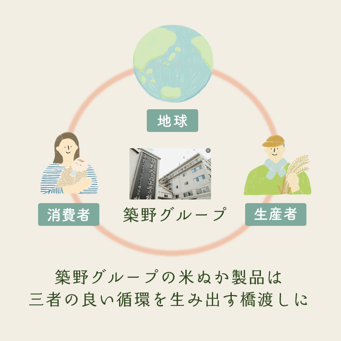 築野食品工業は長年、こめ油の原料である米ぬかの成分に着目し、研究を進めてまいりました。精米時に発生する副産物である米ぬかの成分を抽出することで、こめ油だけでなく食品、化学、医療、化粧品等の幅広い分野への高度有効利用をし、米ぬかの100%活用をしています。今後も国内の米ぬかを活用することで地球・生産者・消費者の良い循環の実現を目指していきたいと考えています。