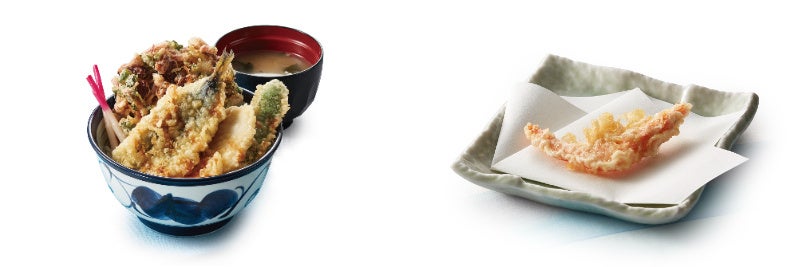 「初夏の海鮮天丼」には、初夏に旬を迎え脂のりが良い「銚子産真いわし」と、小粒でプリプリした食感の「兵庫県産ほたるいか」、淡泊な白身の「国産ヒラメ」を贅沢に。いずれも国産を使用しています。「兵庫県産ほたるいか」は相性のよい「三つ葉」と「紅しょうが」でかき揚げに。鮮やかな彩りとシャキッとした歯応えが特長の「ひらさやいんげん」も添えました。