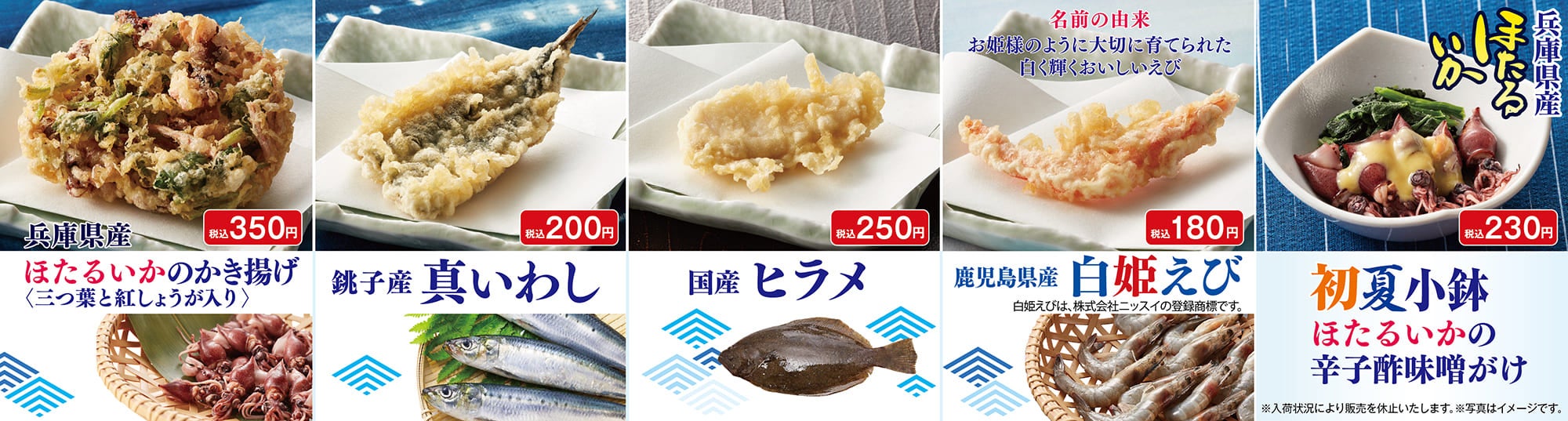 内容:銚子産真いわし、ほたるいかのかき揚げ(三つ葉と紅しょうが入り)、 国産ヒラメ、ひらさやいんげん