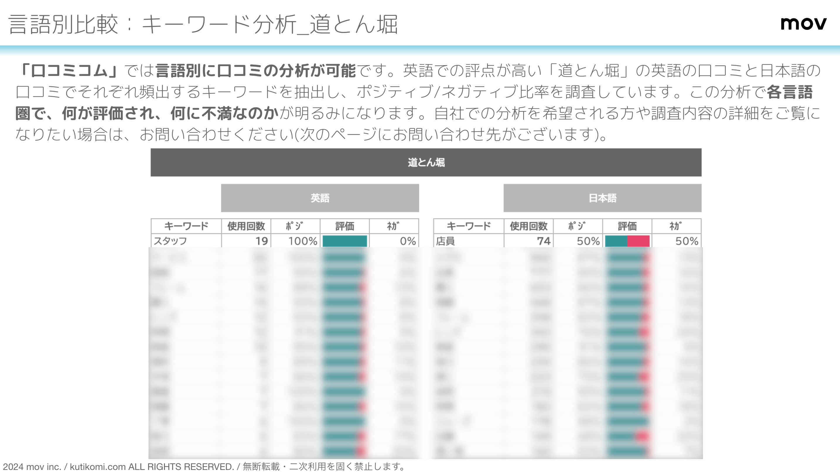 英語での評点が高い「道とん堀」の英語の口コミと日本語の口コミでそれぞれ頻出するキーワードを抽出し、ポジティブ/ネガティブ比率を調査しています。