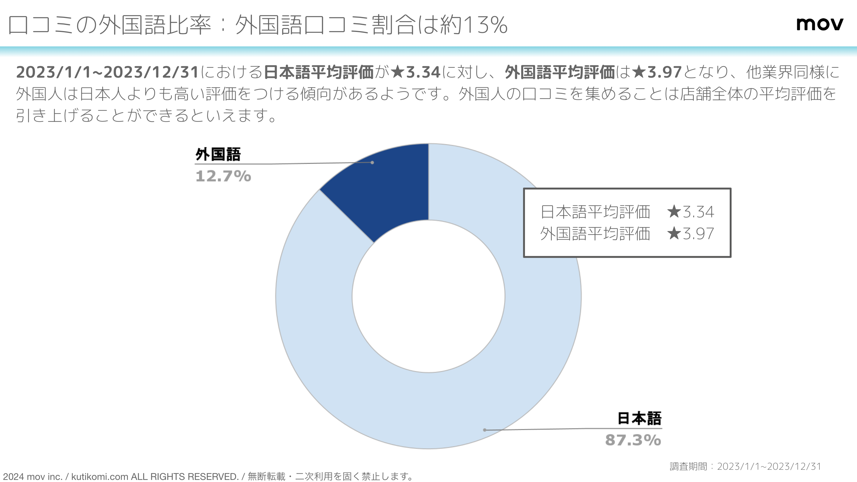 2023/1/1〜2023/12/31における日本語平均評価が★3.34に対し、外国語平均評価は★3.97となり、他業界同様に外国人は日本人よりも高い評価をつける傾向があるようです。