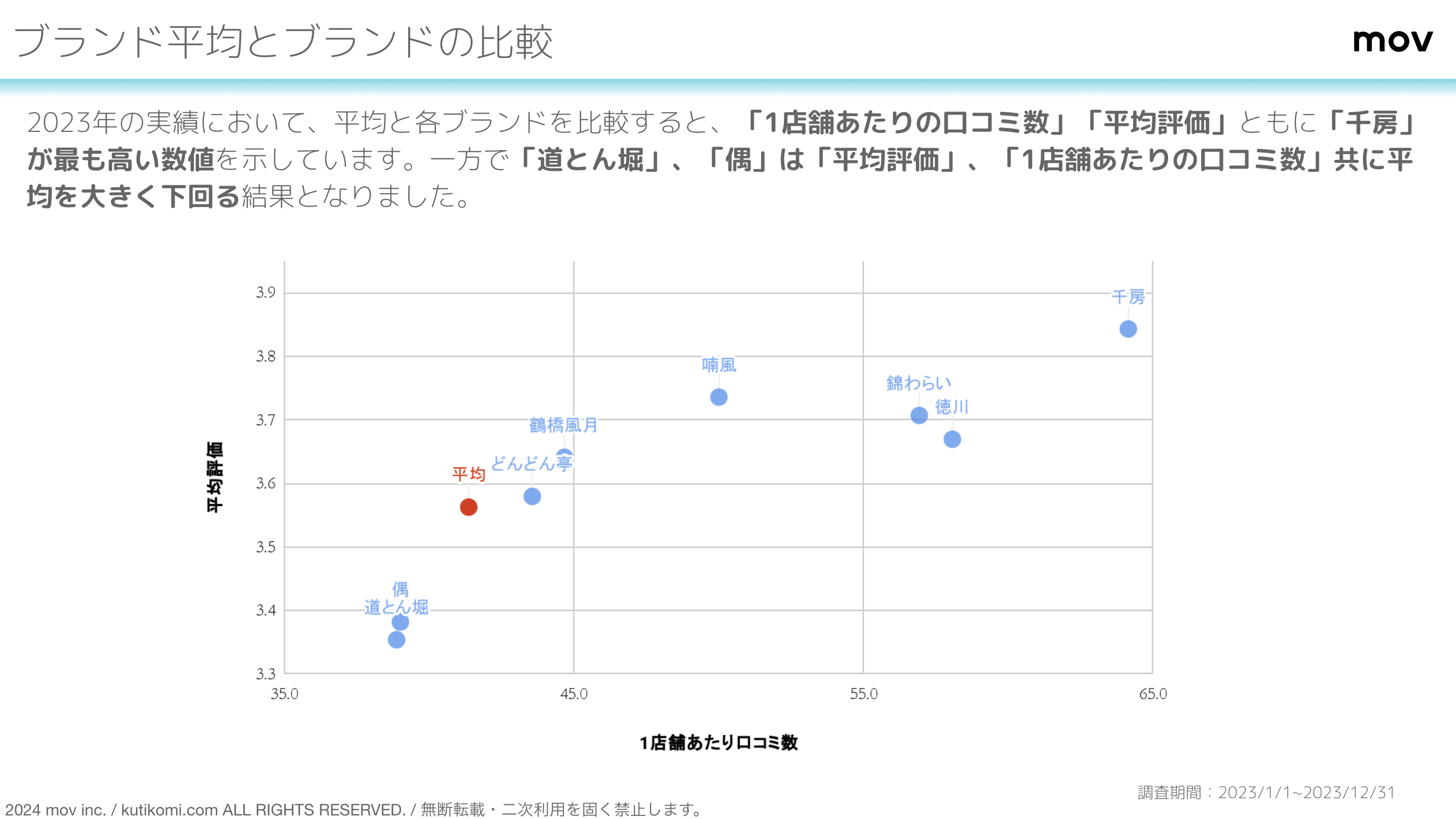 2023年の実績において、平均と各ブランドを比較すると、「1店舗あたりの口コミ数」「平均評価」ともに「千房」が最も高い数値を示しています。