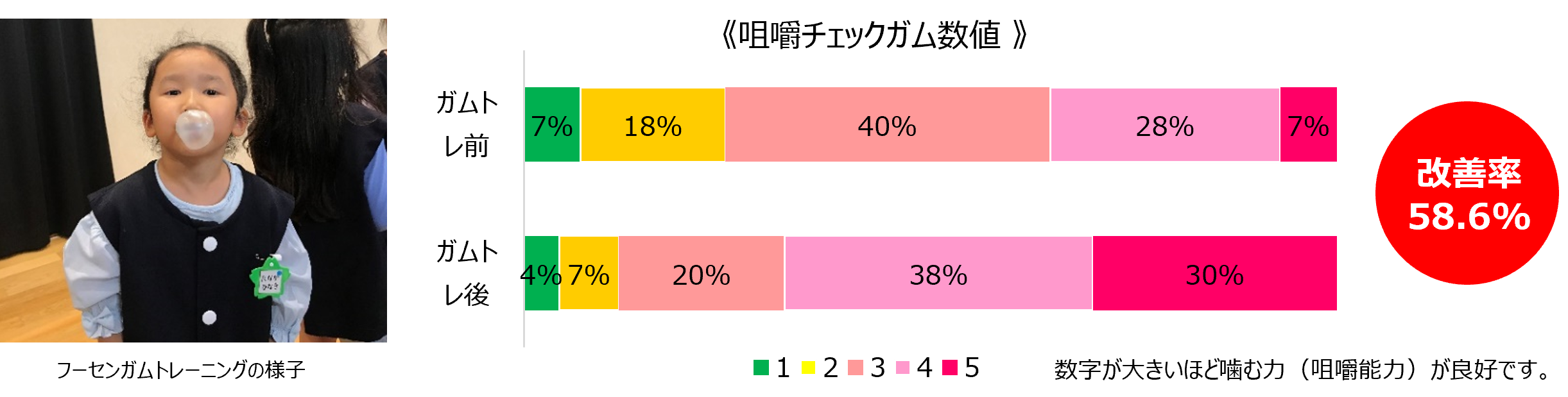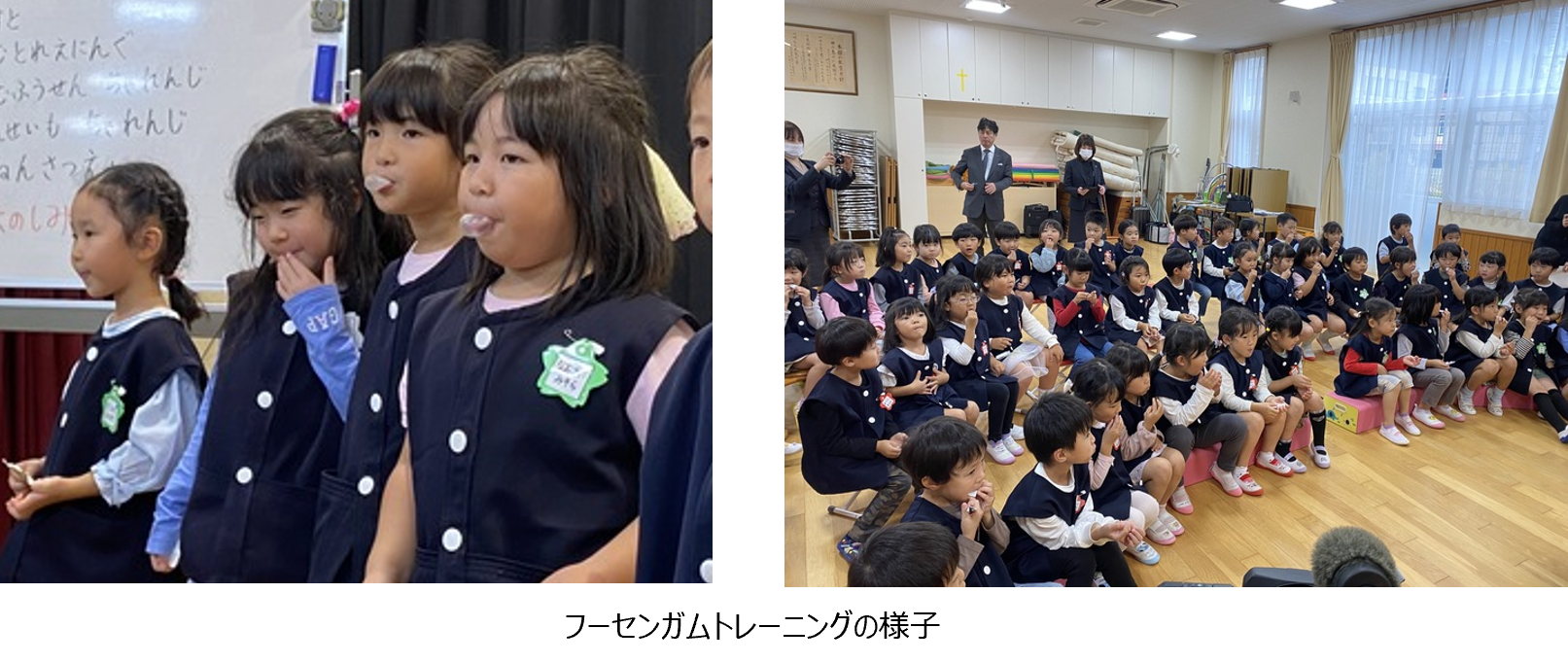 近年、歯ごたえのある食物を噛めない、上手に飲み込めないといった子どもが増加しており、口の発達の重要性が認識され、口腔機能発達不全症の管理が2018年より保険収載されました。また、口腔機能発達不全の一つである口唇閉鎖不全(お口ポカン)はむし歯や歯周病、鼻閉、アレルギー、歯並びの悪化など様々なトラブルの要因となると言われています。一方、山口県内の保育所、幼稚園、認定こども園等を対象にしたアンケート調査結果(*1)から子どもたちの口腔機能の低下を懸念する声が多く挙がりました。そのための対策として手軽に楽しく口腔のトレーニングができるフーセンガムの実証実験を、学校法人徳山めぐみ幼稚園(山口県周南市/園長:村田 佳奈)で2022年に行いました。その結果、フーセンガムトレーニングを70日間行うことで、咀嚼能力および唇の巧緻性の向上が認められ、子どもの口腔機能の健全な発育の一助になる事が分かりました(*2)。