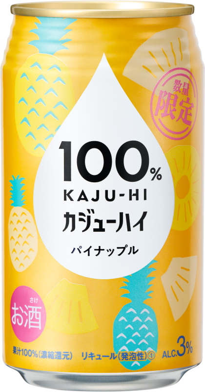 『100% カジューハイ』は果実のめぐみ(濃縮果汁)をお酒で割るから「カジューハイ」と名付けられた、新しいカテゴリーのお酒です。果汁100%だから味わえる果実本来の豊かなめぐみと、アルコール度数3%の程よいアルコール感が特徴です。酔いすぎないから心地よくリラックスでき、果汁100%だから果実本来の美味しさが味わえる、リラックス感と贅沢さを融合させた特別なお酒です。自分の時間を自分らしく楽しむ新しいアルコールユーザーのニーズに応えて開発されました。今回は、数量限定で〈パイナップル〉フレーバーを発売することで、同ブランドのさらなるファン拡大を図ります。
