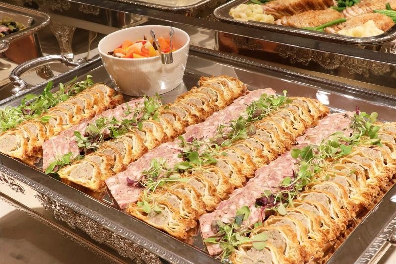 ■メニュー例:ホテル特製ローストビーフ(カッティングサービス)/えばらハーブ豚未来パヴェソテ/鮪のタルタールと野菜マリネ/スモークサーモン/香草パテとソーション/ローリエ特製こんにゃく入りビーフカレー/ミラノ風ラザドリア など約30種類※仕入れ状況によりメニューは変更となる場合がございます。