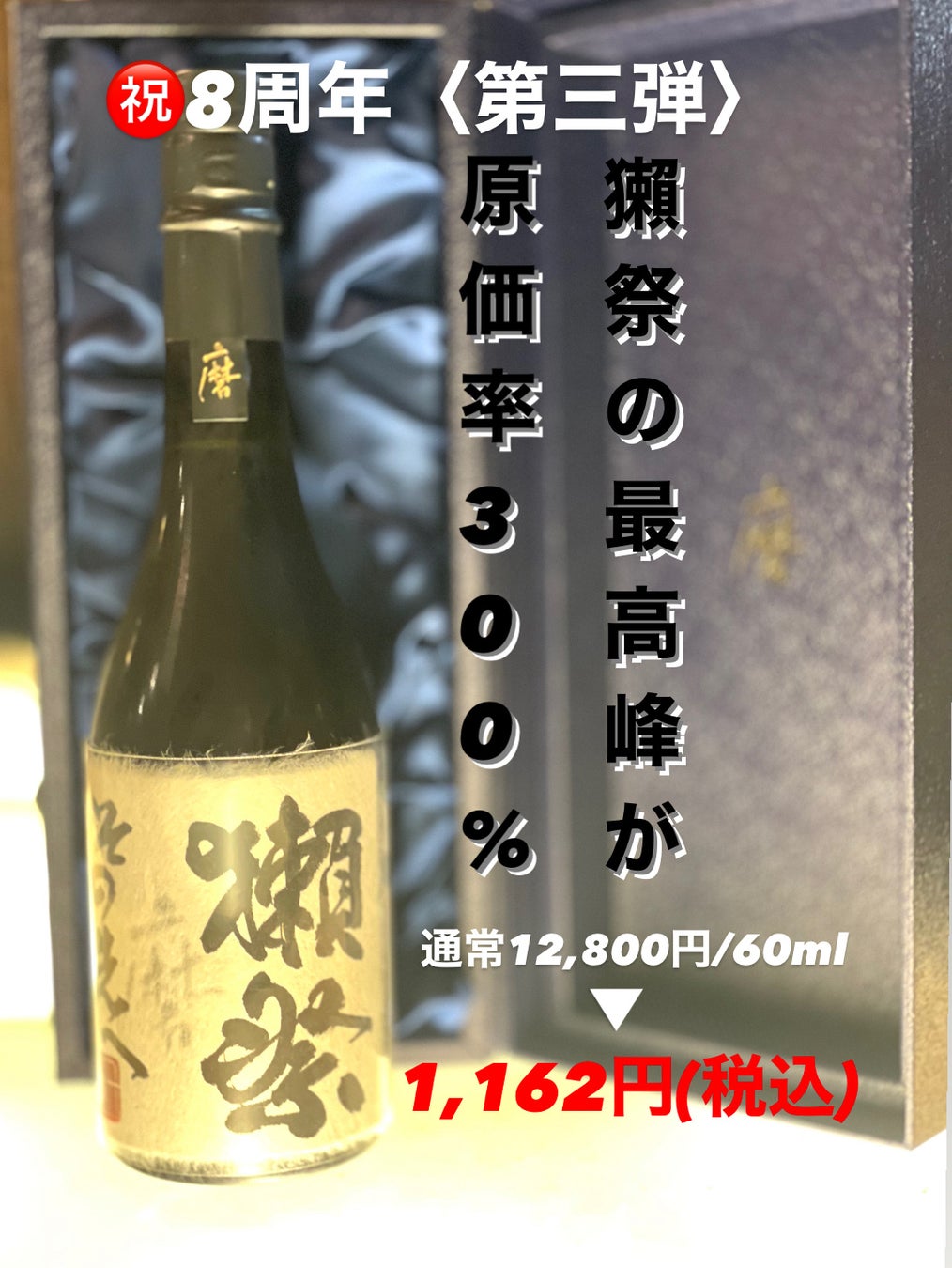 47都道府県の日本酒がすべて勢揃い、夢酒新宿本店は、オープン8周年を記念して獺祭の最高峰である『獺祭磨きその先へ』を驚異の原価率300%でご提供致します。『(通常)14,080円→1,162円』