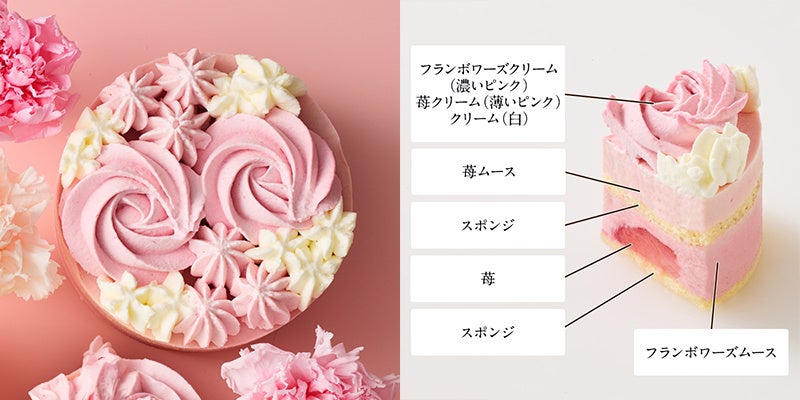 天面には、フランボワーズクリームやフレーズクリーム、生クリームの3種を華やかに絞りました。ミルキーな味わいの中にも甘酸っぱさを感じるクリームは小さなブーケをイメージしています。母の日の贈り物としてもぴったりなスイーツです。