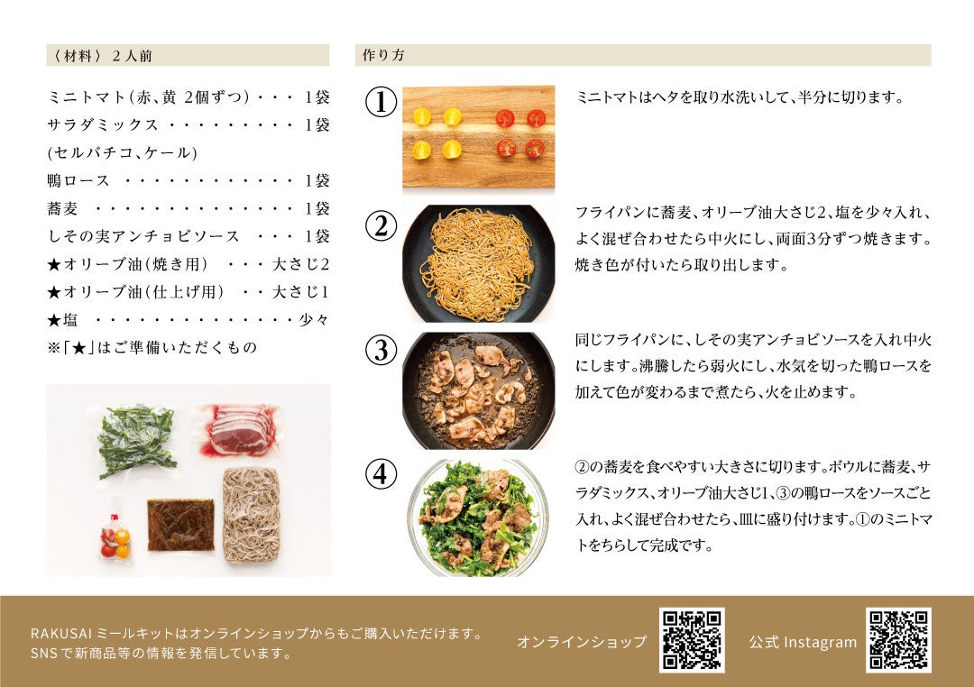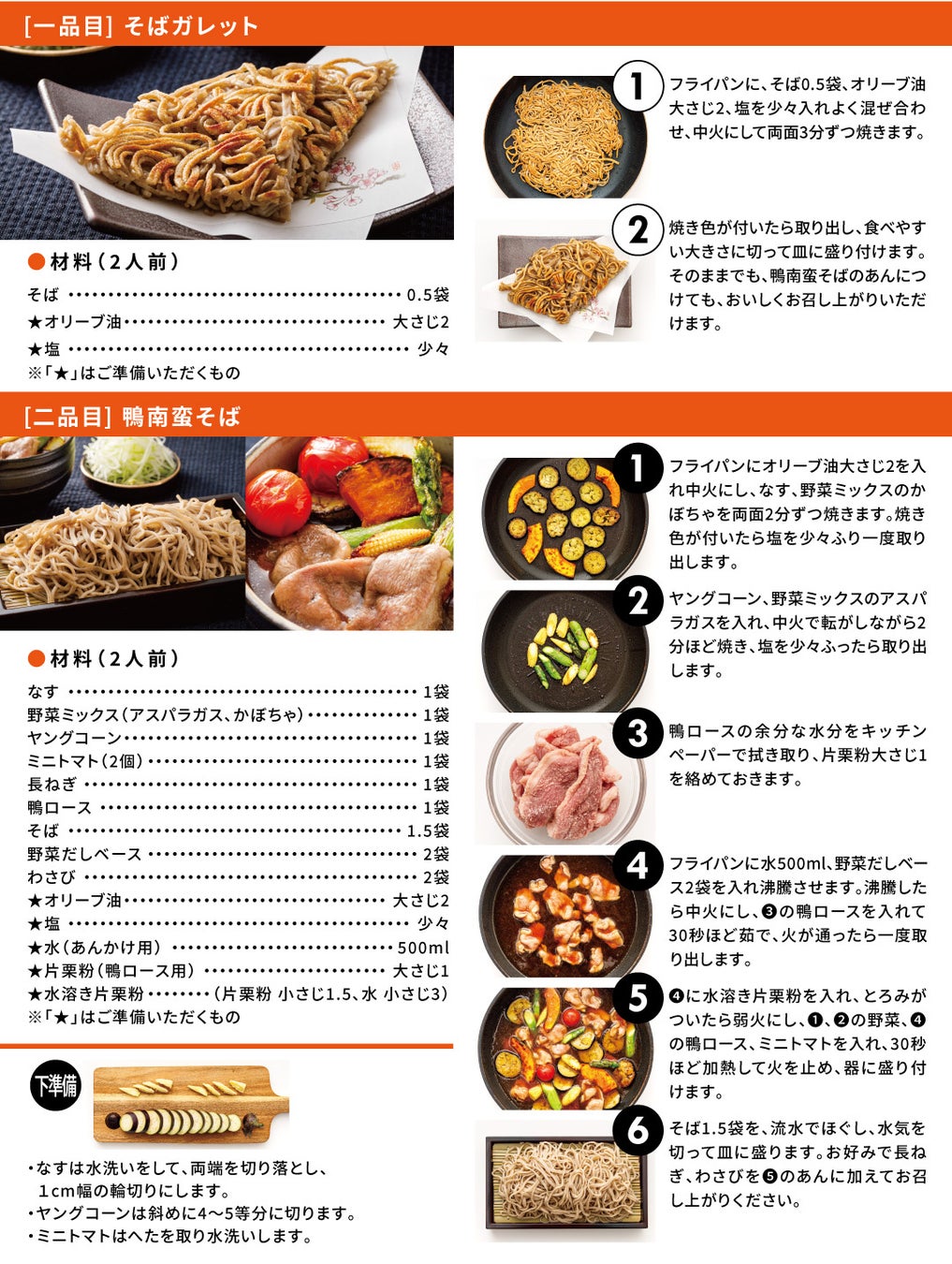 ① 6種野菜の鴨南蛮そば ② 鴨肉と焼き蕎麦のサラダ~しその実アンチョビソース~ |
