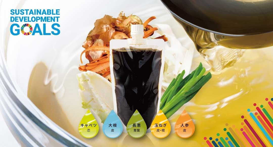RAKUSAIは、青果流通を担うデリカフーズグループから生まれました。デリカフーズグループは、カット野菜を製造しており、取扱商品は1,000種類以上もあります。カット野菜を製造する上で、野菜の皮や葉、芯、根など、通常捨てられている野菜は年間10,000t以上にもなります。これらの野菜をサスティナブルな『ベジブロード』 ( 英語とイタリア語の造語で「野菜を使って作った出汁 」) として有効活用しています。 野菜の皮や芯には、通常の可食部よりも多くの栄養成分や旨味成分が含まれており、カラダにも自然にも優しい野菜だしです。