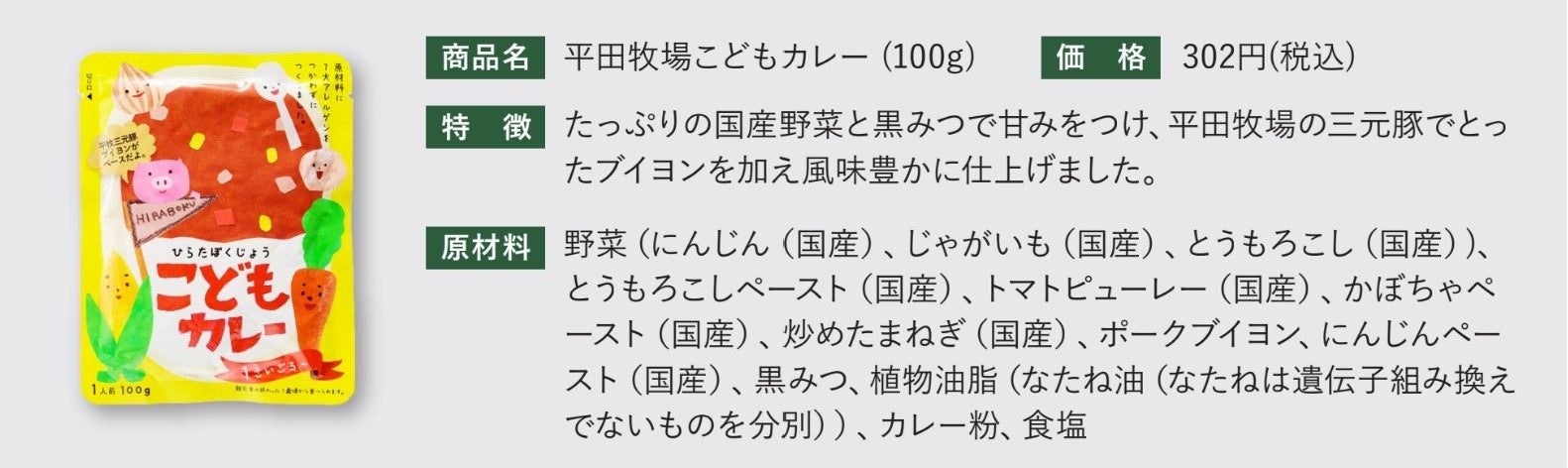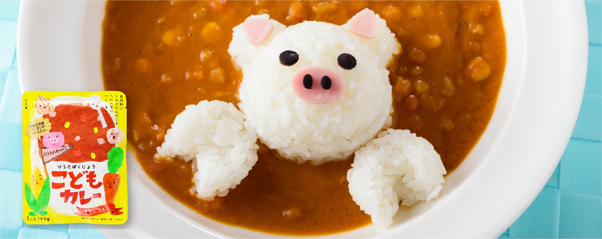 酒田のこどもたちの健やかな成長を祈念しはじまった取り組みで、今年で4年目を迎えます。「平田牧場こどもカレー」の対象年齢は1歳頃からです。1歳頃になると上下の前歯がそろいはじめ、歯ぐきでかんだりつぶしたりできるようになります。具材は小さくカットし歯ぐきでつぶせる柔らかさで、辛味の少ないカレー粉を使い、小さなお子さまでも食べやすい工夫をしています。原材料に卵、乳、小麦、そば、えび、かに、落花生の7大アレルゲンを使用せず、食品添加物も使用しておりません。