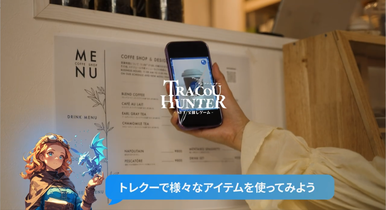 本サービスは、トレーディングカード要素を組み合わせ、GPSを活用し、現実空間の位置情報をトリガーにNFTトレカ型クーポンの「トレクー」が受け取れる、宝探し感覚のデジタルマップサービスです。