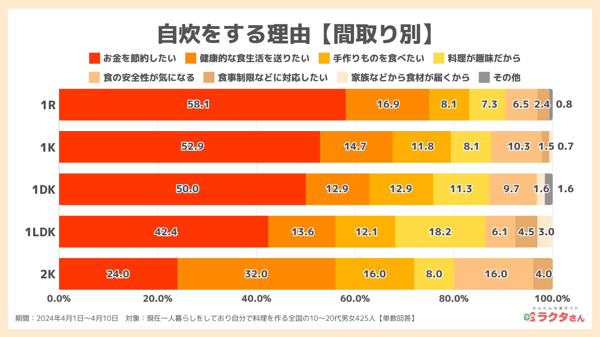 広めの間取りに住むの方が、比較的経済的に余裕があると考えられ、結果として節約よりも健康面など他の理由で料理をしている人が多く占めています。