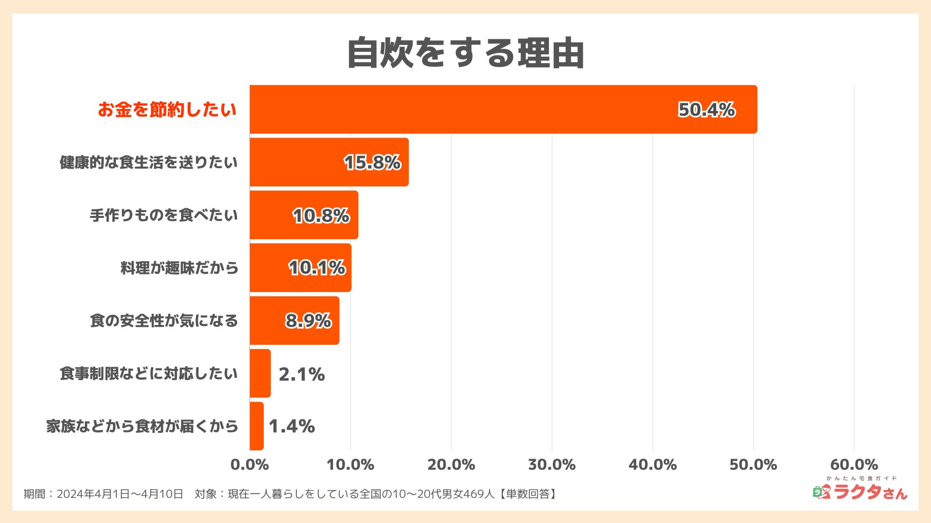 自炊をする人にその理由を聞いてみると「お金を節約したい(50.4%)」が最も多く、次いで「健康的な食生活を送りたい(15.8%)」、「手作りの物を食べたい(10.8%)」でした。