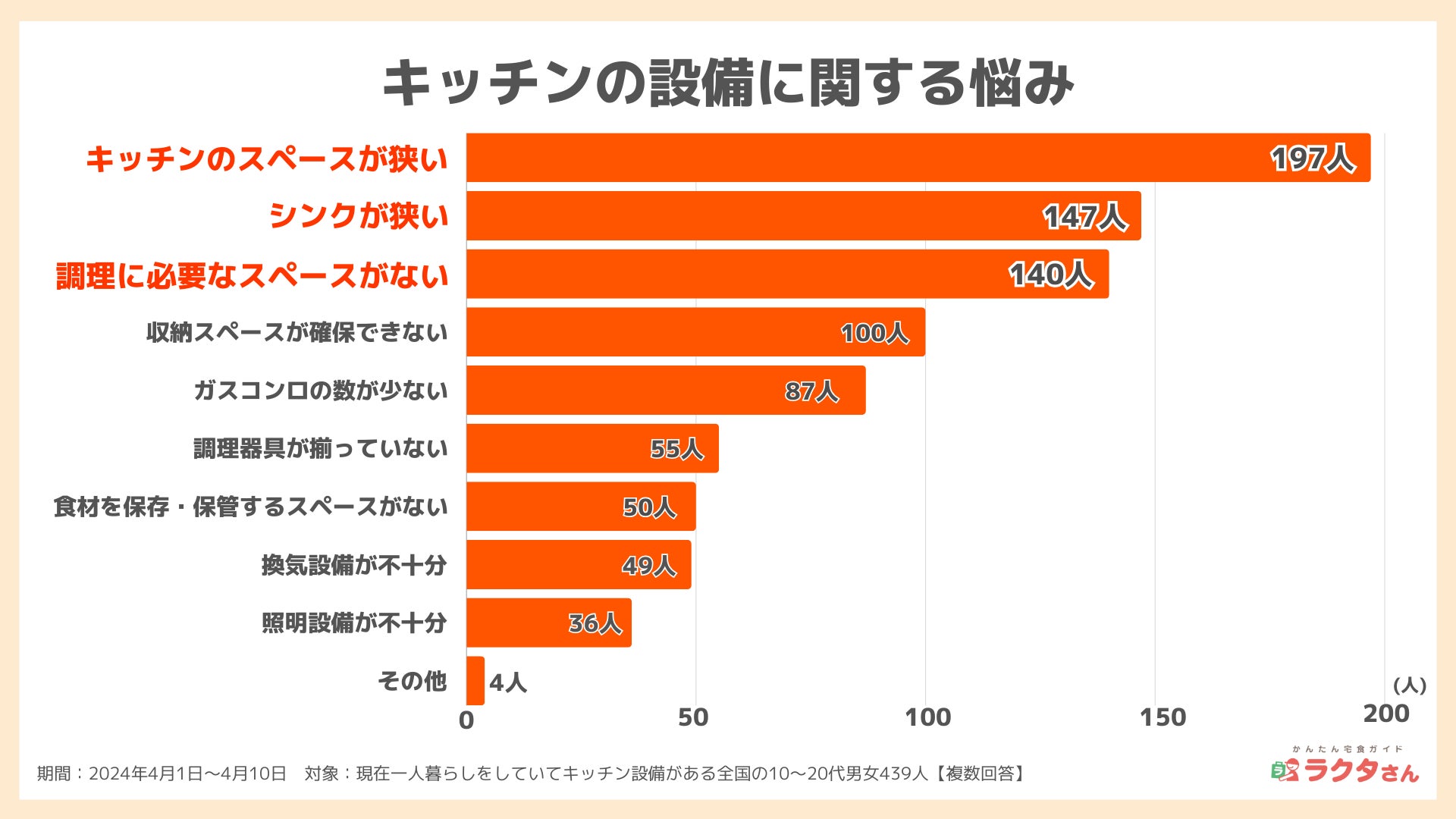 キッチンがある部屋に住んでいる439人に、設備環境に関する悩みを聞いた結果、最も多かったのは「キッチンスペースが狭い(197人)」、2番目は「シンクが狭い(147人)」、3番目は「調理に必要なスペースがない(140人)」でした。