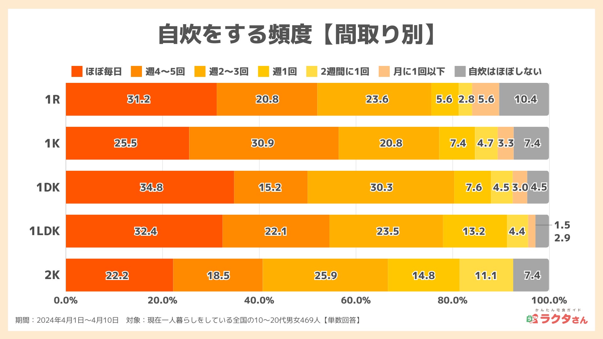 なお、自炊をほぼしていない割合が最も高かったのは1Rで10.4%でした。キッチンのスペースの狭さを悩みに挙げている人が50%を超えていたことを加味すると、1Rに住む人にとって、料理環境・設備が整っていないことが、自炊の頻度にも影響している可能性がありそうです。