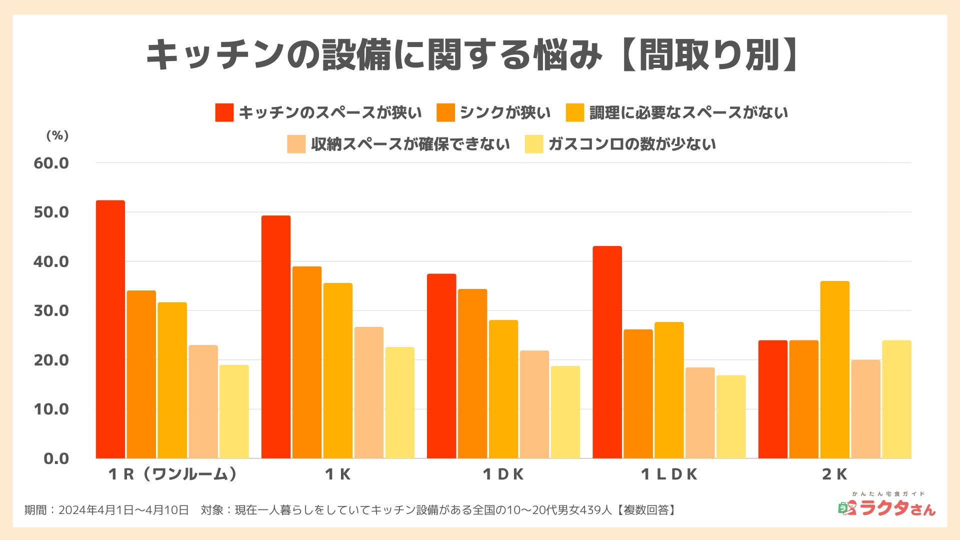この結果を間取り別で比較したところ、2K以外は「キッチンのスペースが狭い」が1位に選ばれていました。特に、1R・1Kに住む人では全体の約5割と、他よりも割合が高くなっています。1Rや1Kタイプの場合、コンパクトな設備である可能性が高いため、キッチン自体のスペースが狭いと感じている人が多いのでしょう。