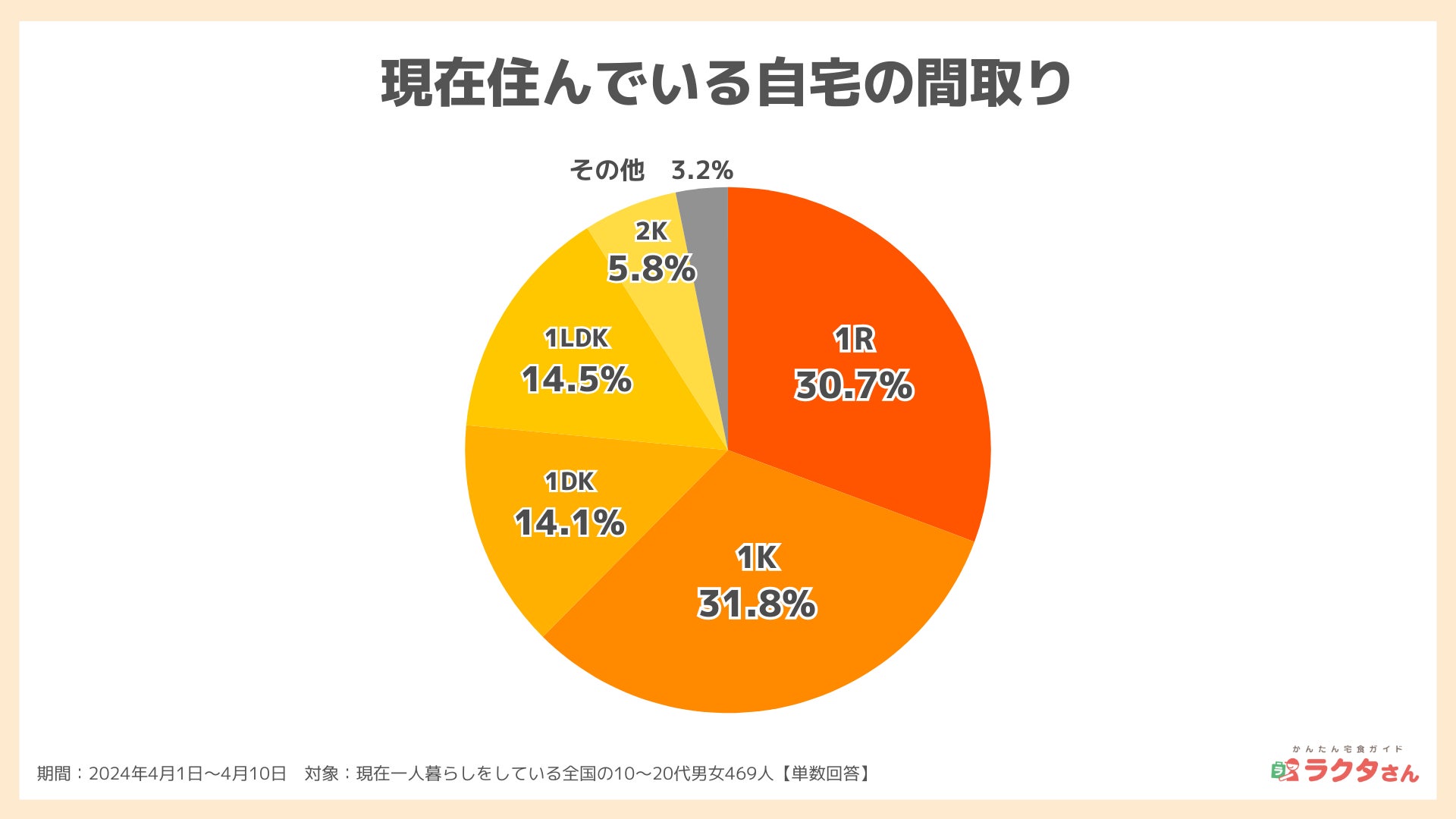 一人暮らしをしている人に、現在住んでいる部屋の間取りを聞いてみると「1K(31.8%)」が最も多く、次いで「1R(30.7%)」、「1LDK(14.5%)」でした。