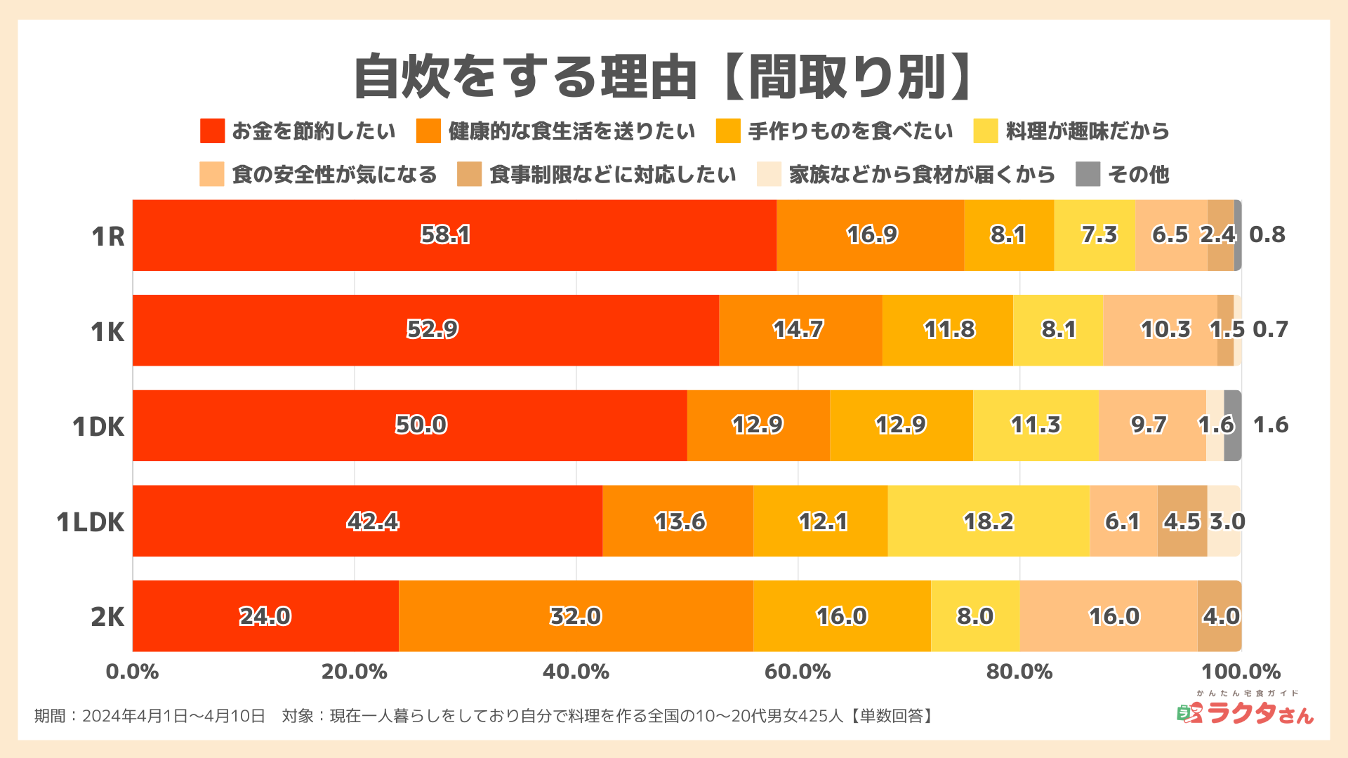 間取り別に見ると、「お金を節約したいから」という理由の人は、部屋数が増えるにつれて割合が少なくなる傾向にあることがわかります。特に1Rに住む人は、58.1%という6割近くの人が、節約のために日々料理をしているという結果でした。
