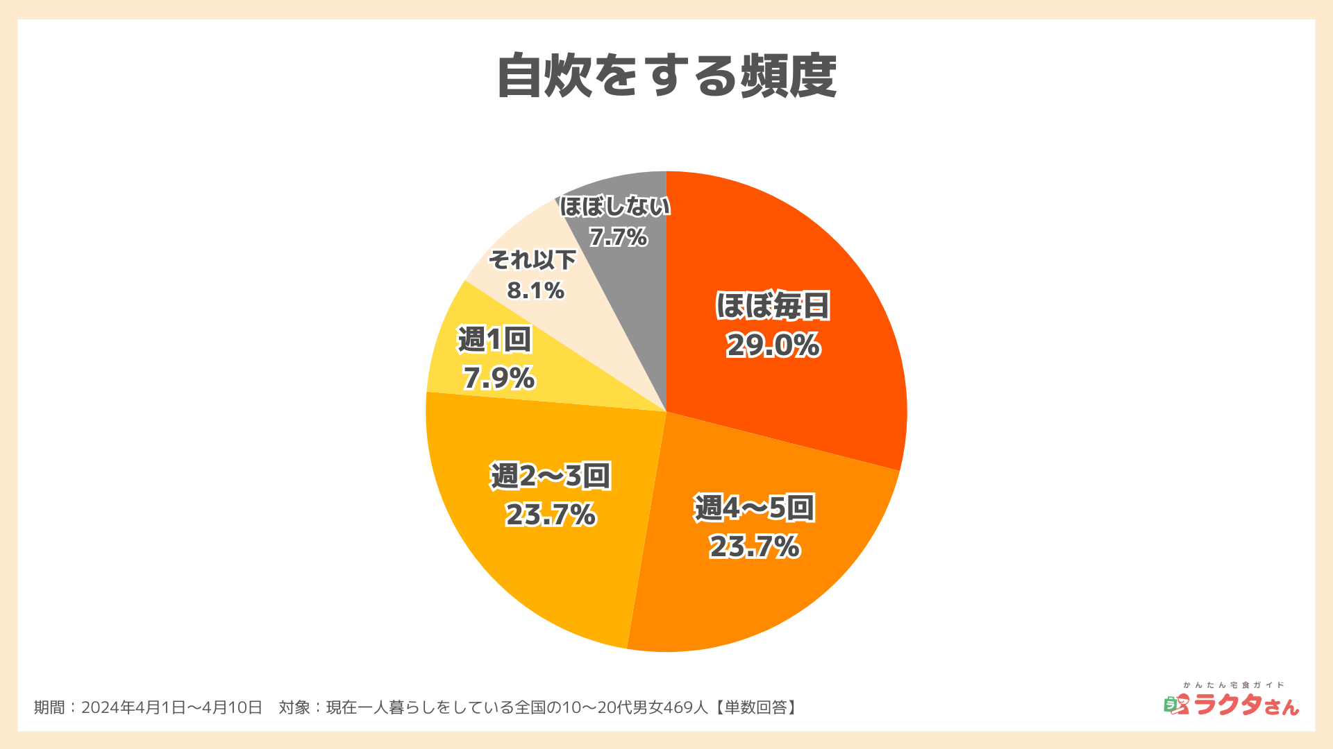 自分で料理をする頻度を尋ねると、「ほぼ毎日(29.0%)」が最も多く、次いで「週4~5回(23.7%)」、「週2~3回(23.7%)」でした。