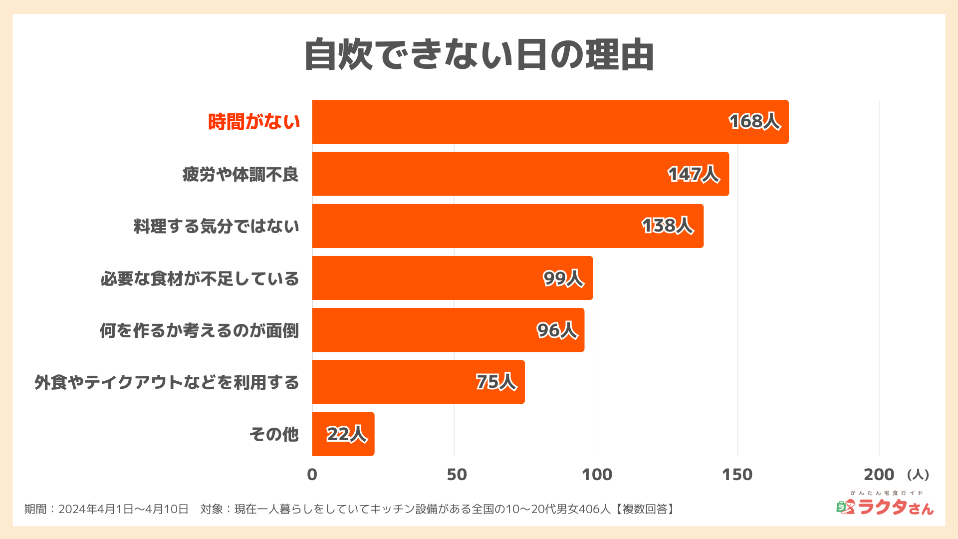 自炊している人に、自炊ができない日の理由について尋ねると、1位「時間がない(168人)」、2位「疲労や体調不良(147人)」、3位「料理する気分ではない(138人)」でした。