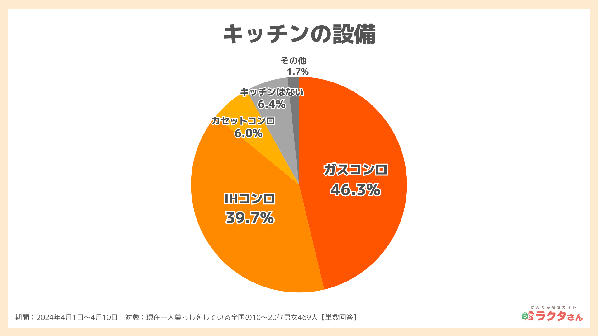 一人暮らしのキッチンの設備は「ガスコンロ」が最多、「IHコンロ」を6.6pt上回る