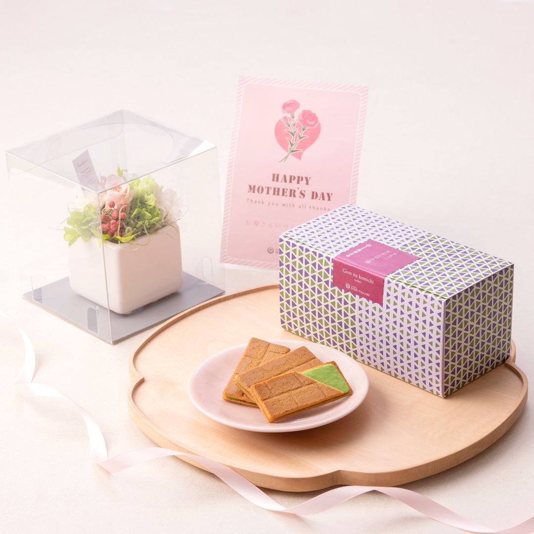 石畳をイメージしたせんべいに濃厚な抹茶クリームをサンドした「ぎおんの小路」とプリザーブドフラワー