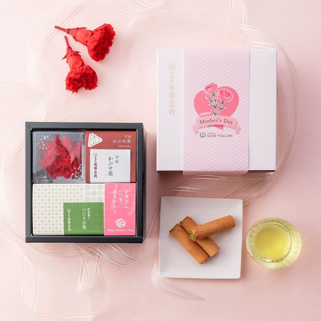 そのほかにも、「つじりの里」に母の日の象徴であるカーネーションを添えた定番の「カーネーション付宇治茶・抹茶菓子セット」や、Amazon限定でメッセージカード付きの新商品「花とぎおん小路の母の日ギフト」も販売いたします。