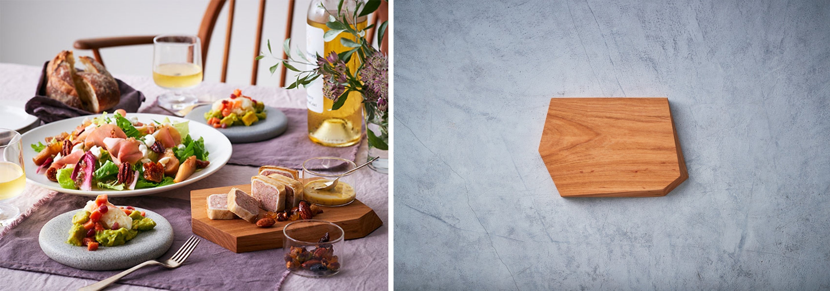パテ・ド・カンパーニュは、ウッドプレート一つでレストランのような佇まいに。アボカドとポテトのサラダは、2回目のシックな丸皿を。コクのある生ハム「ハモン・セラーノ」を使ったサラダは、1回目のプレートに飾るのがおすすめ。