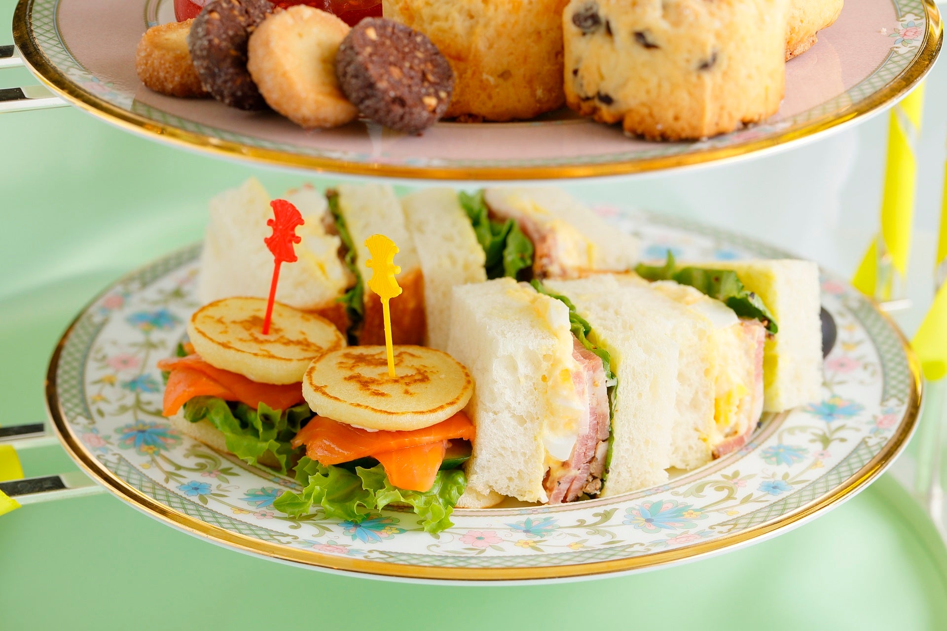上段には翠と山吹の色合い鮮やかなメロンのスイーツプレートが登場。中段は王道のベイクドスイーツとディアマンクッキー、そして下段には軽食にピッタリなサンドイッチとオードブルを盛り付けた華やかなアフタヌーンティーセットです。ベイクドスイーツのスコーンはメロンパン風に焼き上げるなど、パティシエのこだわりを各所に詰め込みました。