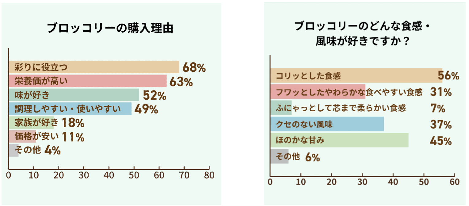 ブロッコリーの好きな食感や風味については、コリッとした食感、ほのかな甘味、クセのない風味が