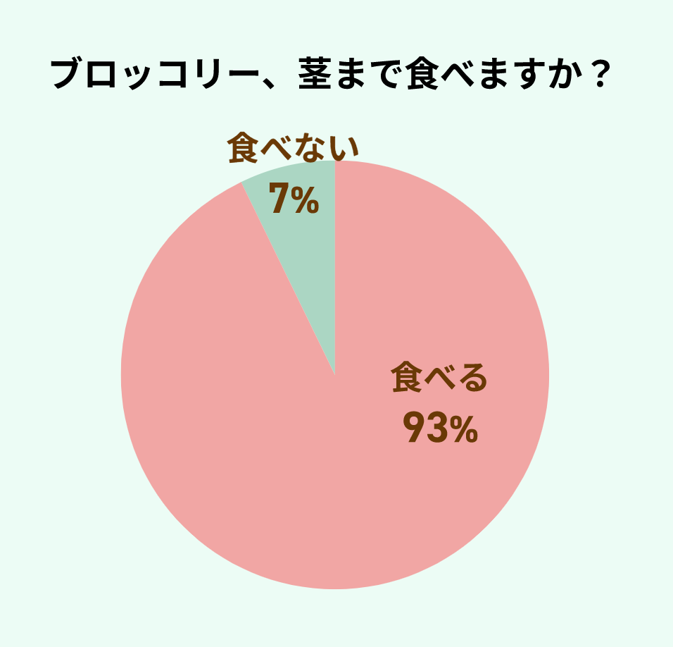 ●ブロッコリーは茎まで食べるか聞いたところ「食べる 93%」という結果に。会員向けアンケートで集まった食べ方メニューは1,600以上。