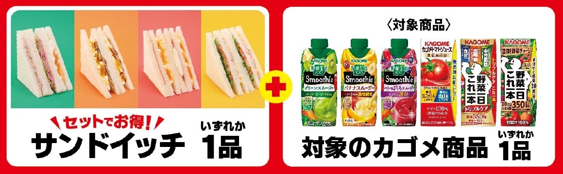 ●発売を記念して、4月16日(火)から4月22日(月)までの期間、サンドイッチと対象のカゴメ商品を一緒に購入すると30円引きになるキャンペーンを実施いたします。ぜひこの機会にお試しください。