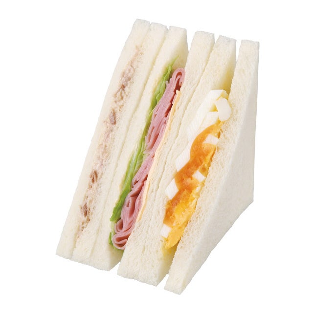 「たまごサラダ」「ハム」「ツナ」の人気の3種類の味が楽しめる定番人気のサンドイッチです。価格を見直し、お求めになりやすい価格になりました!