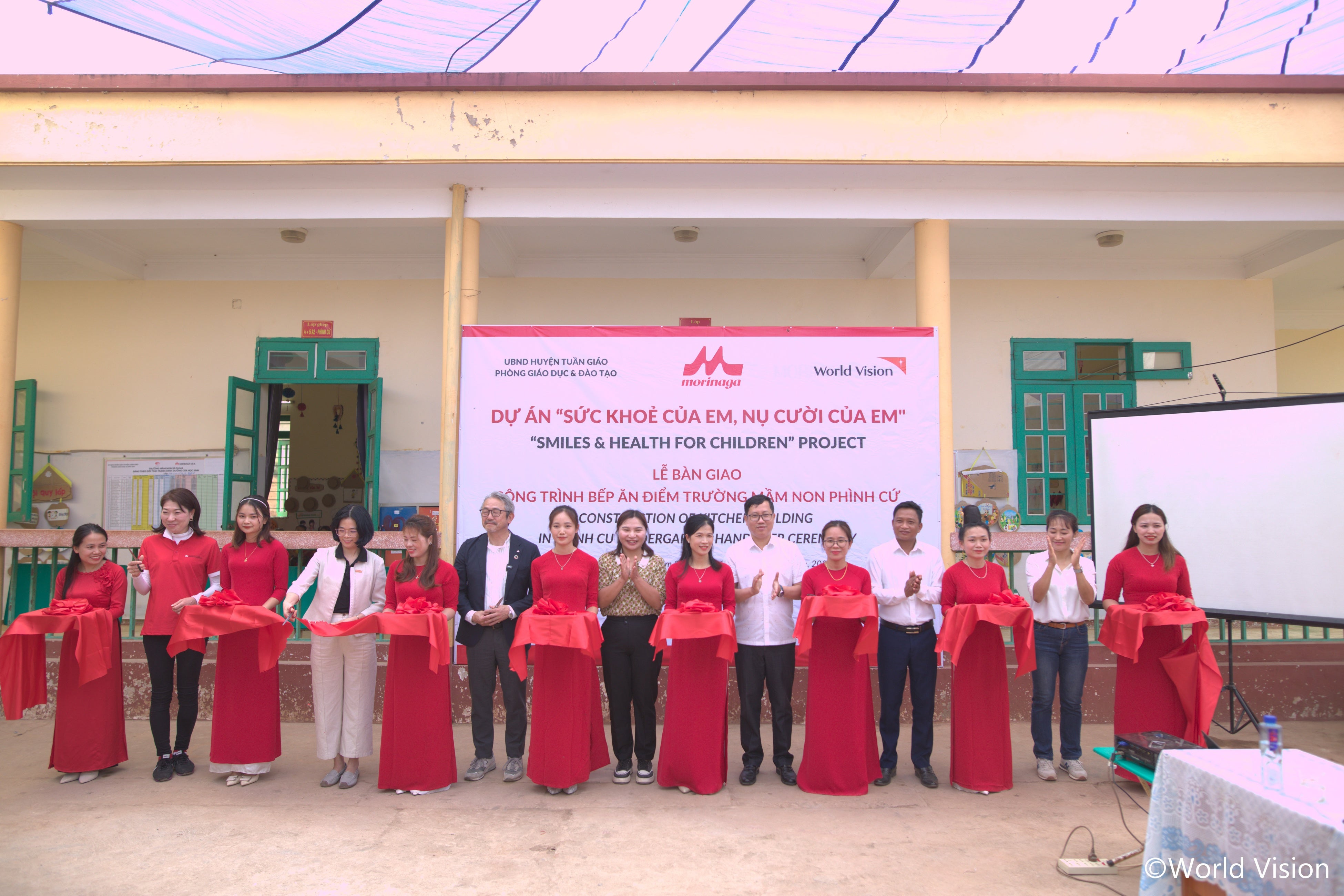 4月11日に行われた給食調理施設の引き渡し式には、園児や幼稚園の教員、調理スタッフ、保護者、コミュニティ関係者の他、ベトナム政府関係者、WVJとワールド・ビジョン・ベトナムのスタッフ、さらに森永乳業グループより11名が参加し、引き渡し式内では、当社取締役 常務執行役員 海外事業本部長 柳田隆宏より「当社海外事業の重要国ベトナムにおいて、当プロジェクトを通じ子供たちの心と体の健康を促進し、笑顔あふれる社会と輝く未来につなげていきたい」と、当プロジェクトの思いと関係者への感謝の意を述べました。引き渡し式では、園に通う子どもたちと新たにできた給食施設内での給食の提供を通じて交流を行いました。出席したコミューン長Lo Van Toi氏からは「郡内の子供たちとコミュニティのウェルビーイングのためにご支援いただき、心より感謝する」と喜びと感謝のお言葉をいただき、沢山の笑顔が見られました。