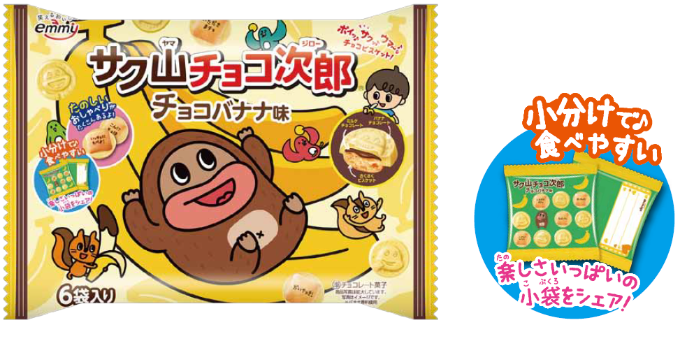 今回、商品ラインナップに期間限定で『6パック サク山チョコ次郎 チョコバナナ味』が新たに仲間入りしました。サク⼭チョコ次郎シリーズ初となる2味のチョコ(チョコとバナナチョコ)の組み合わせです。