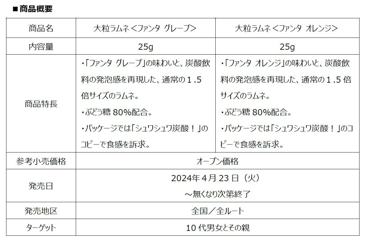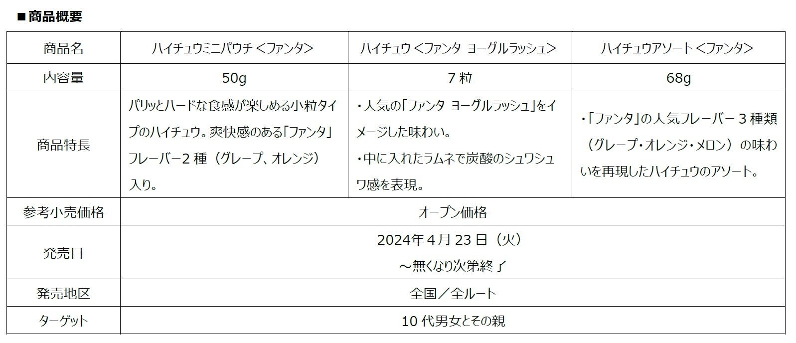 昨年、コラボ商品を発売したところ、大変好評をいただいたため、期間限定で発売します。「ファンタ」の爽快でジューシーなおいしさを、森永製菓の人気菓子「ハイチュウ」「ラムネ」で表現しました。人気の「ファンタ ヨーグルラッシュ」の味わいをイメージした「ハイチュウ<ファンタ ヨーグルラッシュ>」、シュワシュワした炭酸飲料の発泡感を再現した「大粒ラムネ<ファンタ グレープ>」「大粒ラムネ<ファンタ オレンジ>」、人気の「ファンタ」のフレーバーをアソートした「ハイチュウアソート<ファンタ>」です。