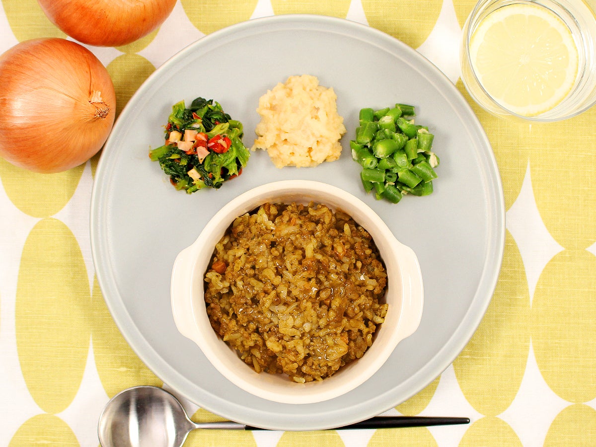 カレーの香りが食欲をそそる!リゾットをご用意しました。炒めた玉ねぎの甘み、チーズのコクが合わさり、さっぱりしつつも奥深い味わいです。糖質を抑えつつ風味がアップしたごはんを限界まで詰め込み、満足感のある一品に仕上げました。温めたあと、すぐによく混ぜて食べていただくのがおすすめです! 副菜は、ほうれん草ベーコンソテー、オニオンがアクセントのポテサラ、インゲンチキンサラダです。