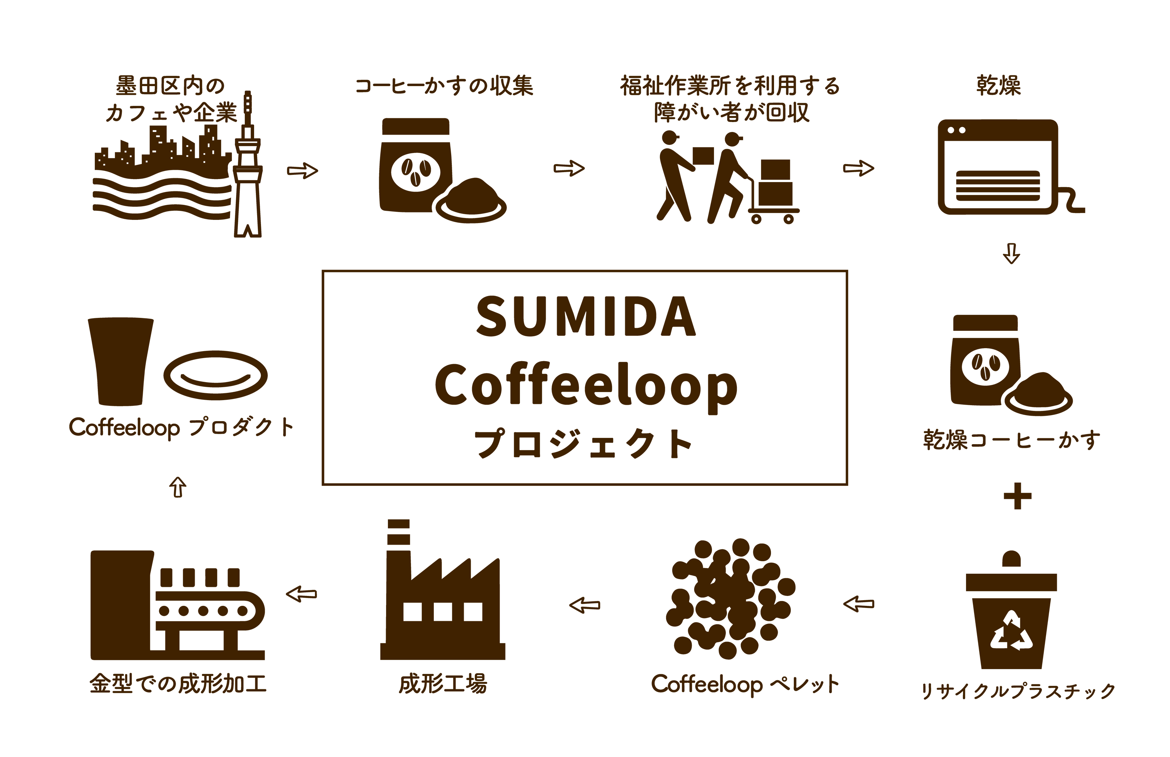 墨田区資源環境部資源循環推進担当との連携のもと、区内のカフェなどから出たコーヒーの豆カスを回収し、「すみだCoffeeloopプロジェクト」オリジナルロゴの「Coffeeloopカップ」を開発するものです。原料となるコーヒーの豆カスの回収は墨田区内の福祉作業所に担っていただくことで、障がい者の方の多様な就労機会の創出にも貢献します。2023年12月頃から区内のカフェなどでカップの利用を開始。店内で何度も使用したのちに劣化・破損したカップはアサヒユウアスが引き取り、カップの状況をみてマテリアルリサイクルか再塗装を施すことで、新たなカップに作り替え、再利用します。