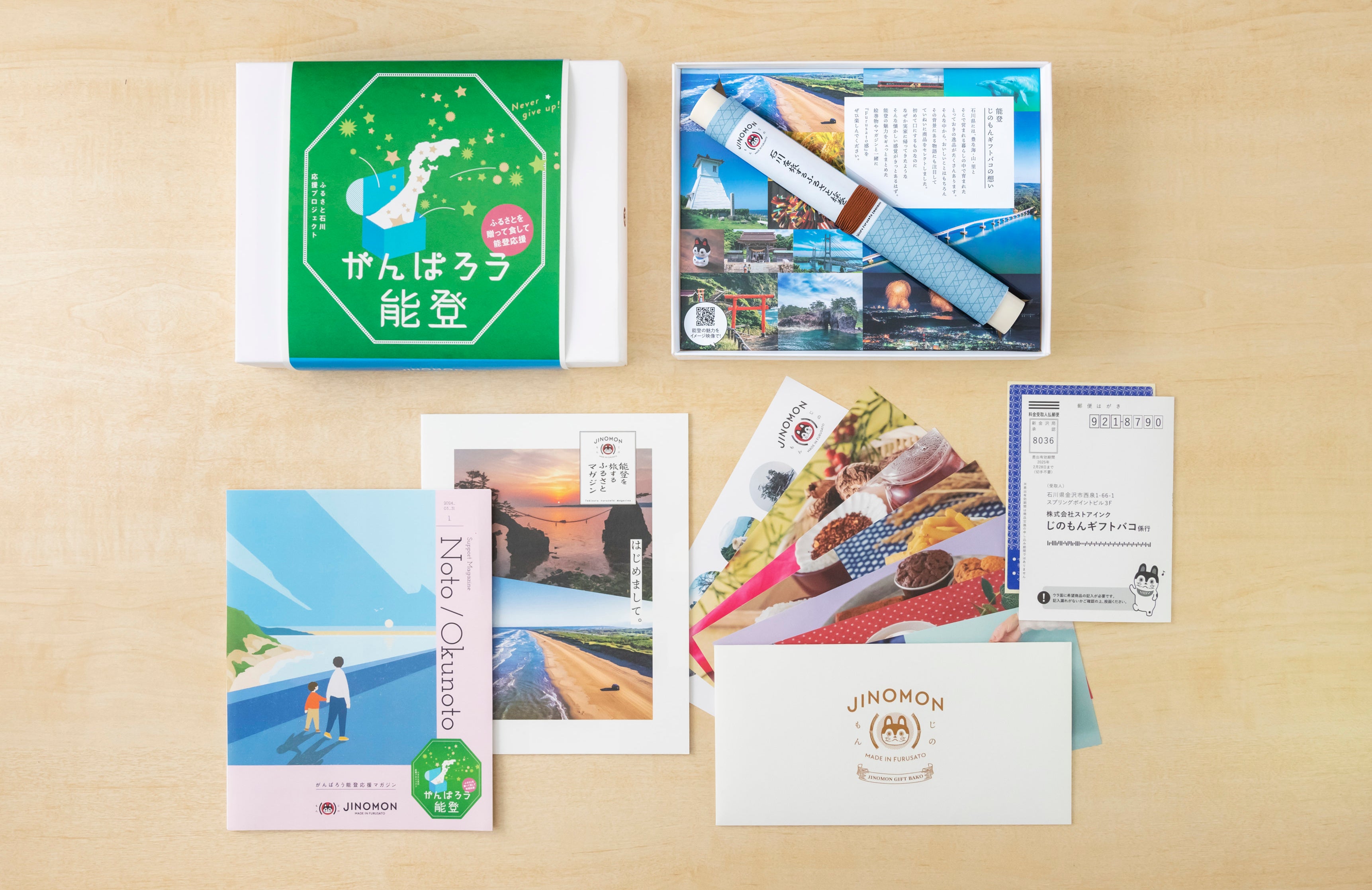 ふるさとは宝の山。メジャーな視点では伝えきれない、ふるさとの本当の魅力やその土地に根付く人々の想い、それらをカタログギフトとして形にした「じのもんギフトバコ」は、石川県で生まれた人や縁のある人が、地元・石川県を懐かしむ気持ちを家族や友人・知人に届けることをコンセプトにしました。受け取った方は「旅するふるさと絵巻物」と「じのもんマガジン」と合わせて、自宅にいながら石川県に行ったようなプチ旅行気分が楽しめます。今回のがんばろう能登『じのもんギフトバコ』は、地震で被災し復興への長い道のりを歩きだした能登のお店の「じのもん」を緊急に集め、カタログギフトにしています。能登・奥能登限定の「旅するふるさと絵巻物」や旅するふるさとマガジン、そして今回緊急に編集した「がんばろう能登応援マガジン」と、能登のお店で販売されている「じのもん」のカード式カタログがセットされています。価格は常温のギフトバコを2種、冷蔵・冷凍のギフトバコを2種、計4種類の特別な能登応援バコとなっています。