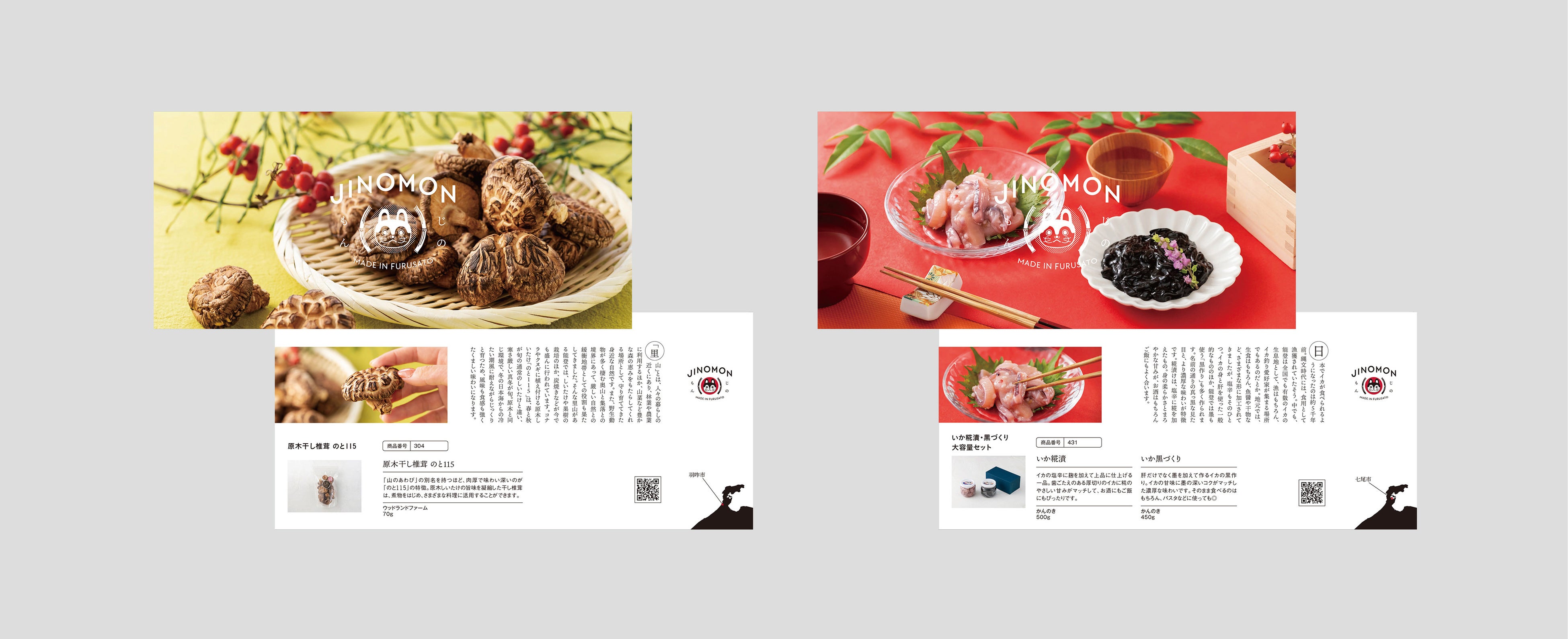 能登のお店の「じのもん」ふるさと情報付カード式カタログは、1商品1枚(表・裏)の構成で、1セット当たり10枚程度が同封されます。気になる1品を選んで注文し、食してふるさと能登のお店を応援できます。
