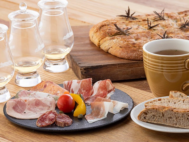 蒸溜所に併設された「常陸野ハム工房 BARREL SMOKE」で製造している自社製の生ハムプレートと、常陸秋そばの蕎麦ふすまを使用した天然酵母パン、茨城県産の新鮮な食材を用いた野菜のグリルと季節のスープをお召し上がりいただけます。