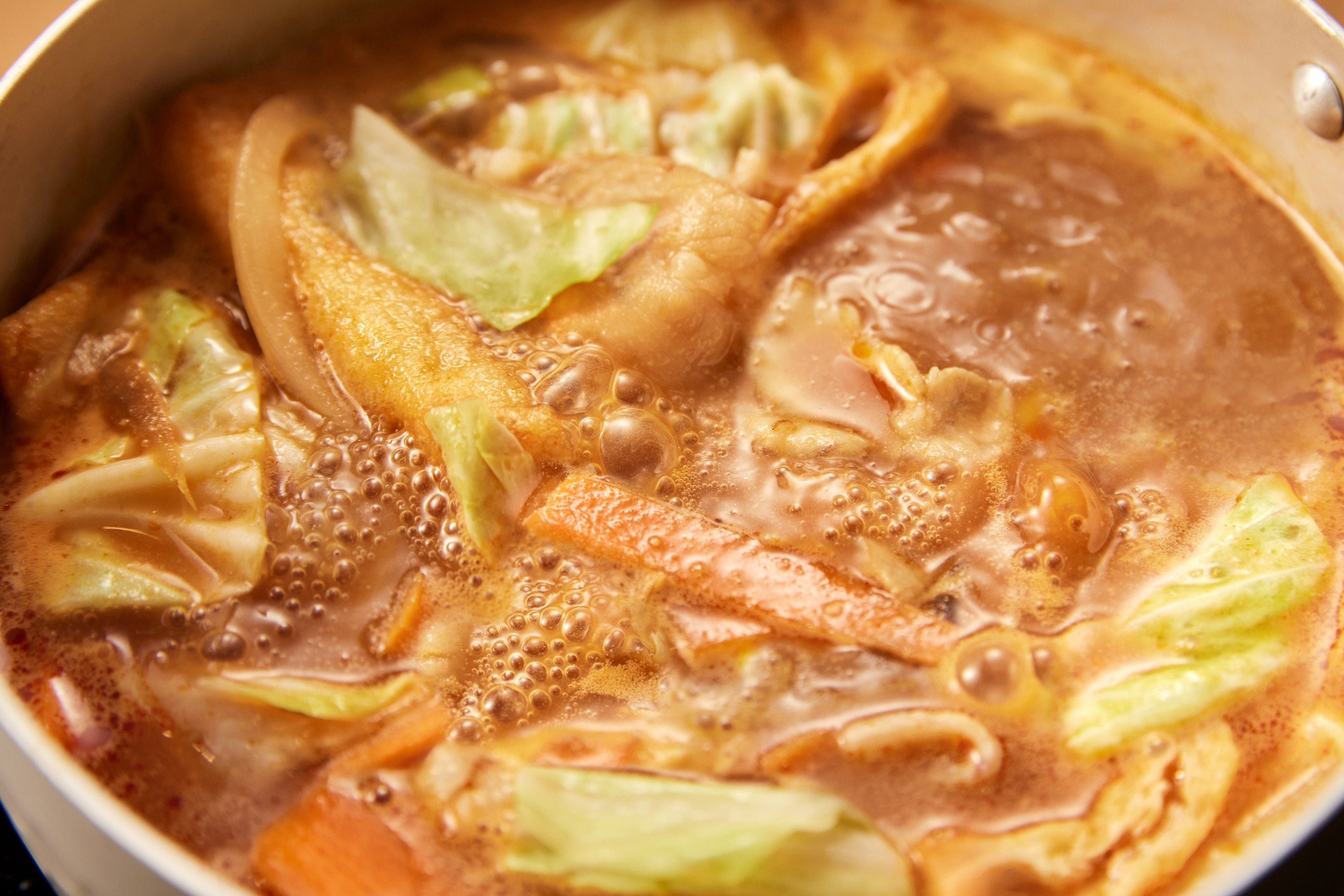 ご注文ごとに、豚肉、キャベツ、たまねぎ、にんじん、ごぼう、油揚げを特製味噌だしと一緒に火にかけます。そうすることでシャキシャキ食感や具材それぞれの旨み、野菜の甘みが染み出しガツンとおいしい味わい。